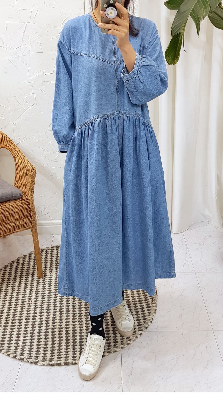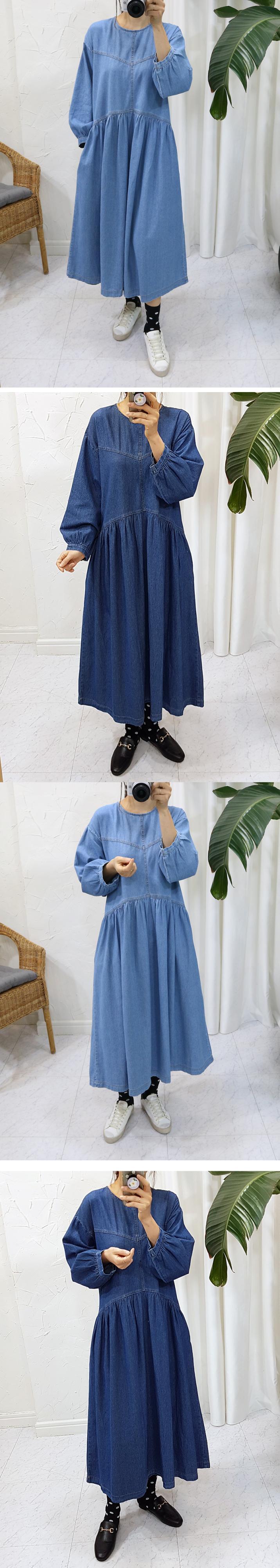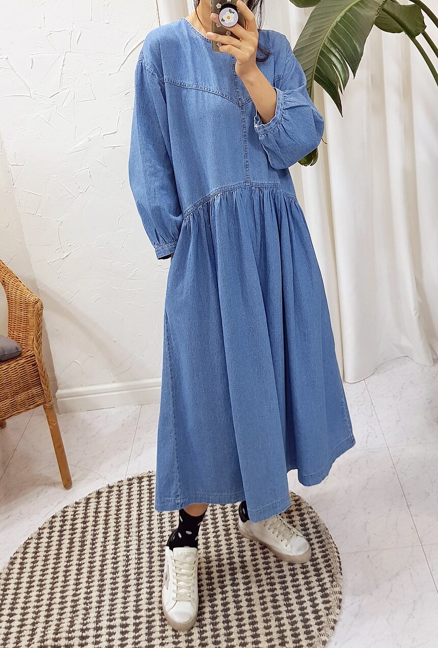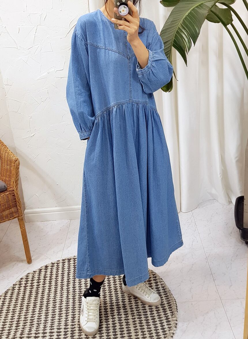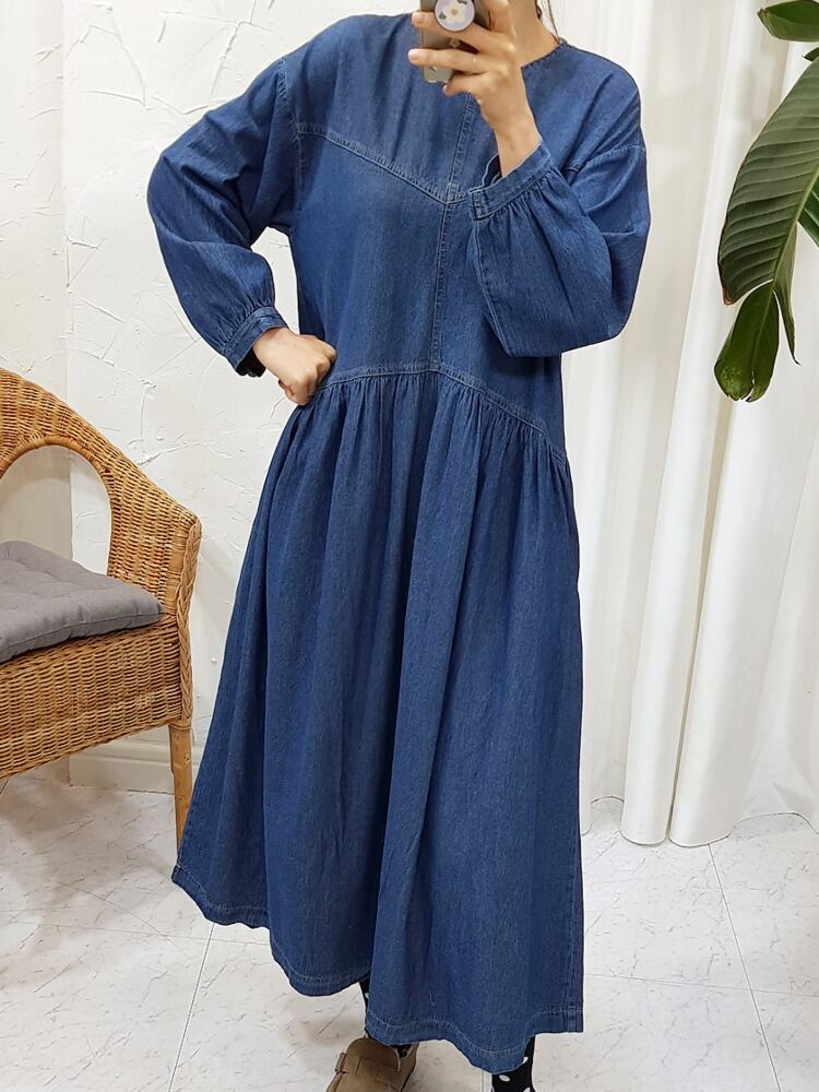 [EWQ] ランタンスリーブ O ネックデニムドレス春 A ラインプリーツスプライシングプルオーバーロングドレス 16Y5635 スプリング 春物 Oネック Aライン