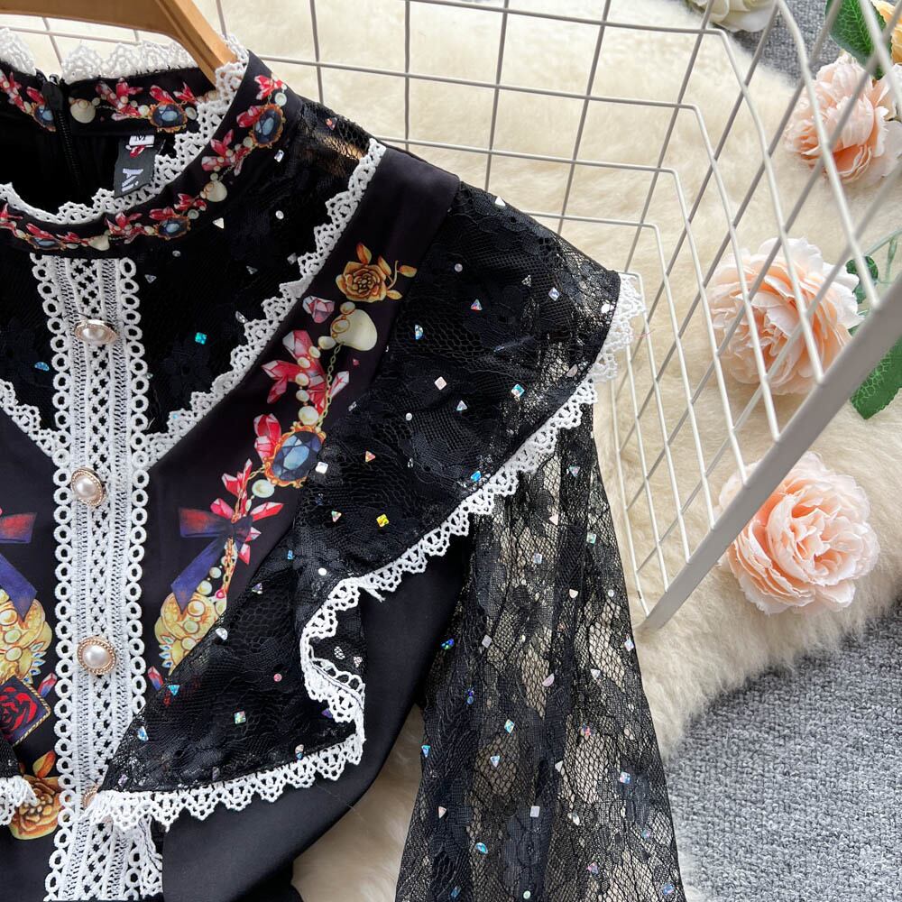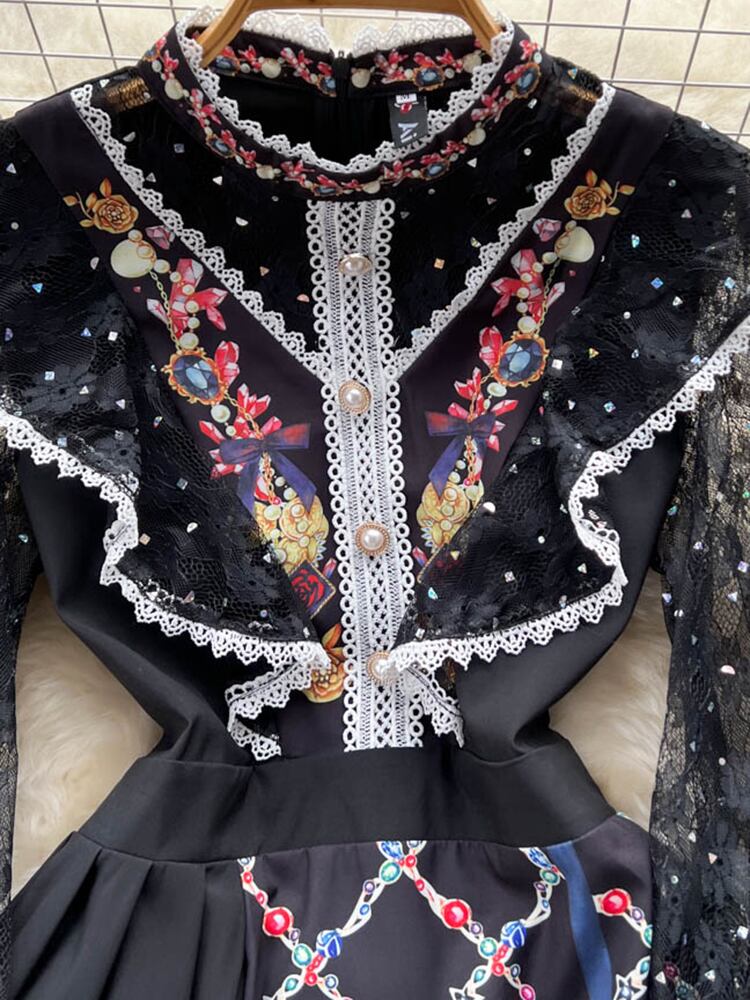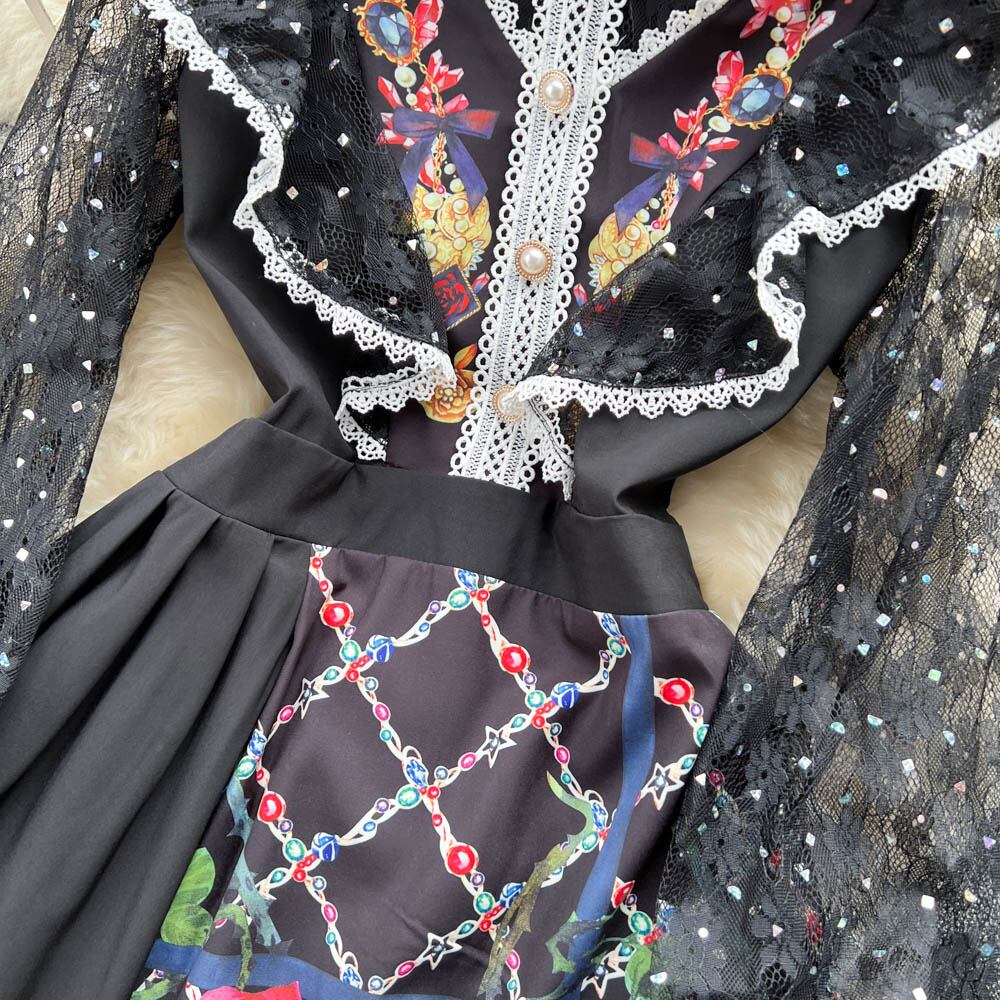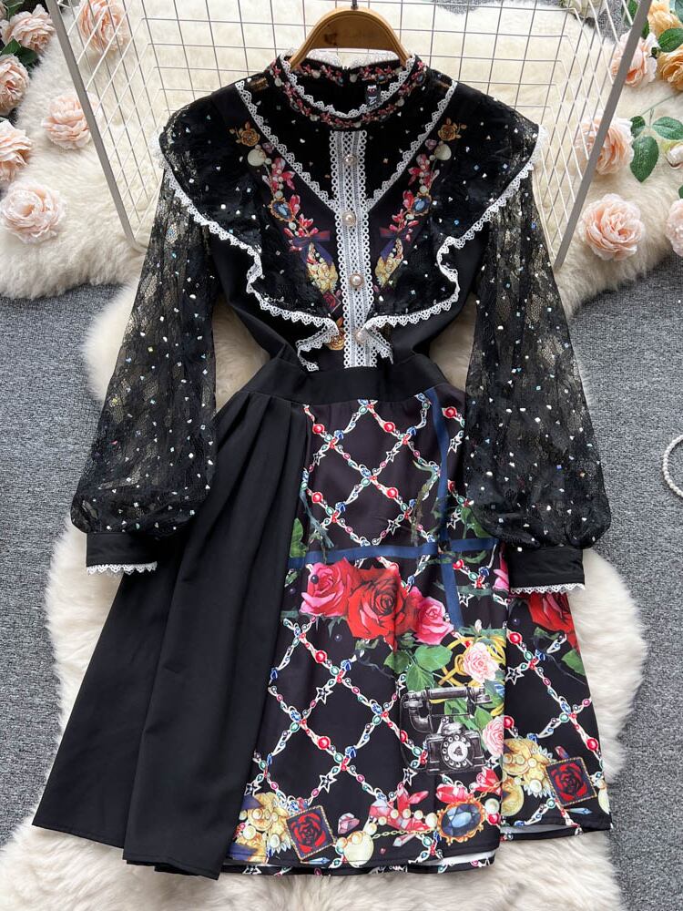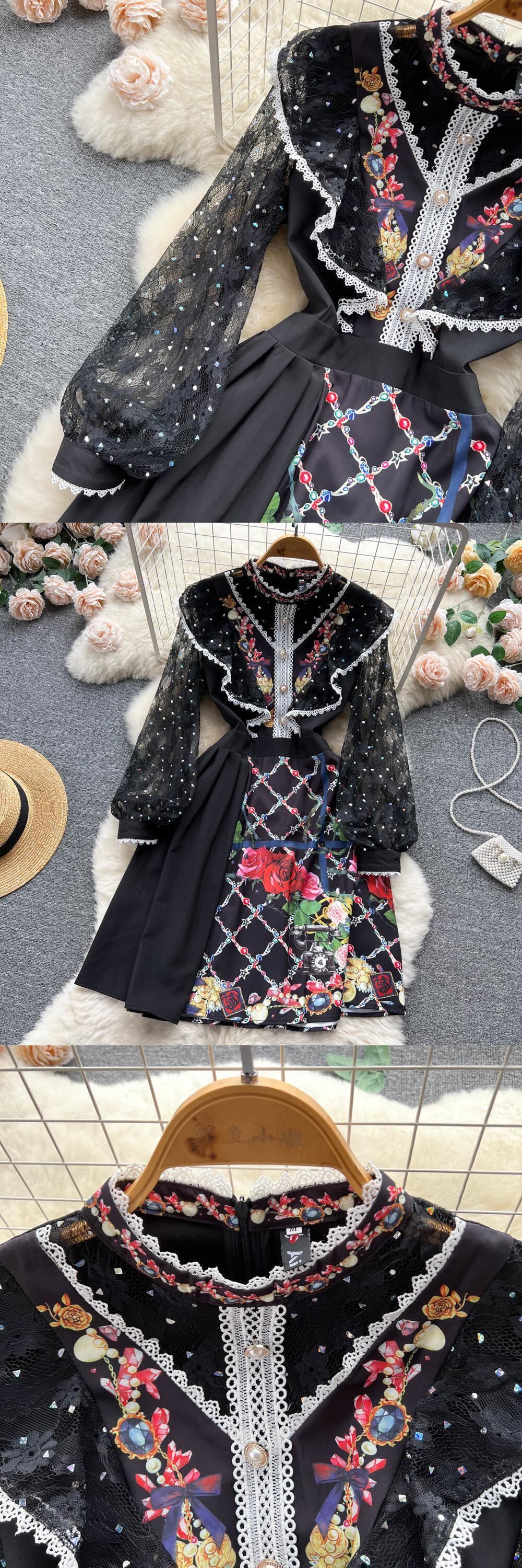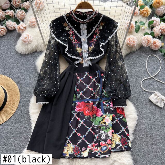 [EWQ] プリント花メッシュ長袖 A ライン ドレスフリル コントラスト O ネック ドレス春秋 Vestido 6Y6716 ロング スプリング 春物 オータム 秋物 Oネック Aライン フラワーデザイン