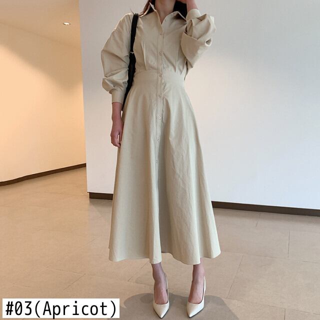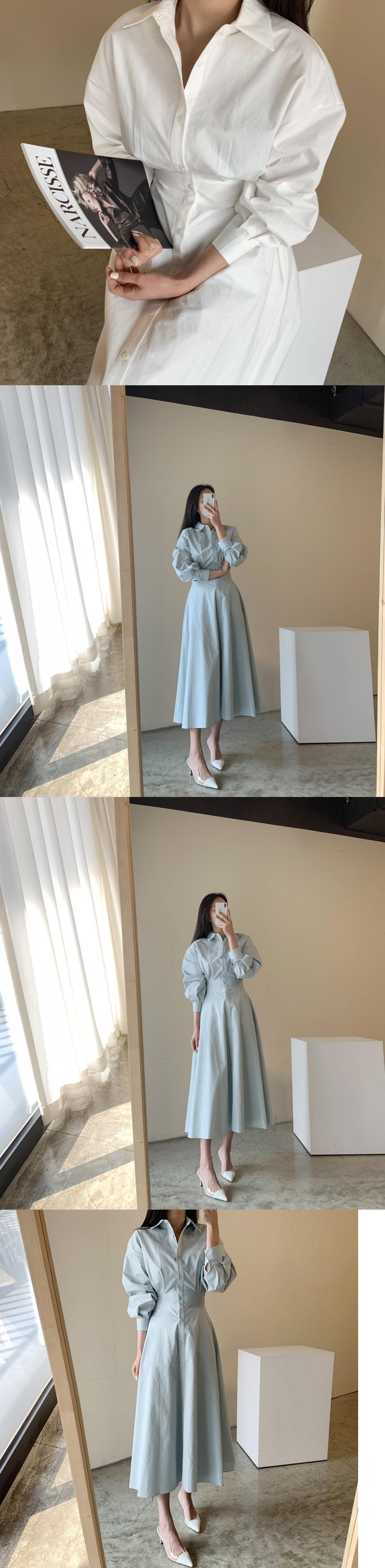 [EWQ] ラペルブルーフォールドコレクトウエストシャツドレス秋シングルブレストミッドカーフランタンスリーブドレス 16R943 オータム 秋物