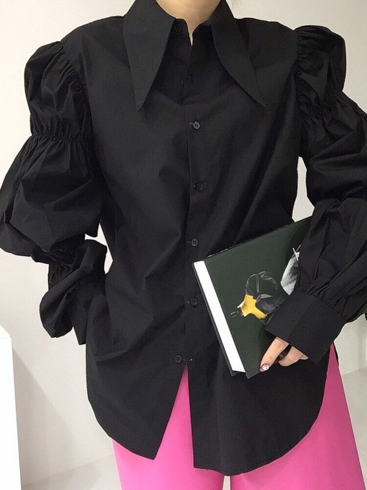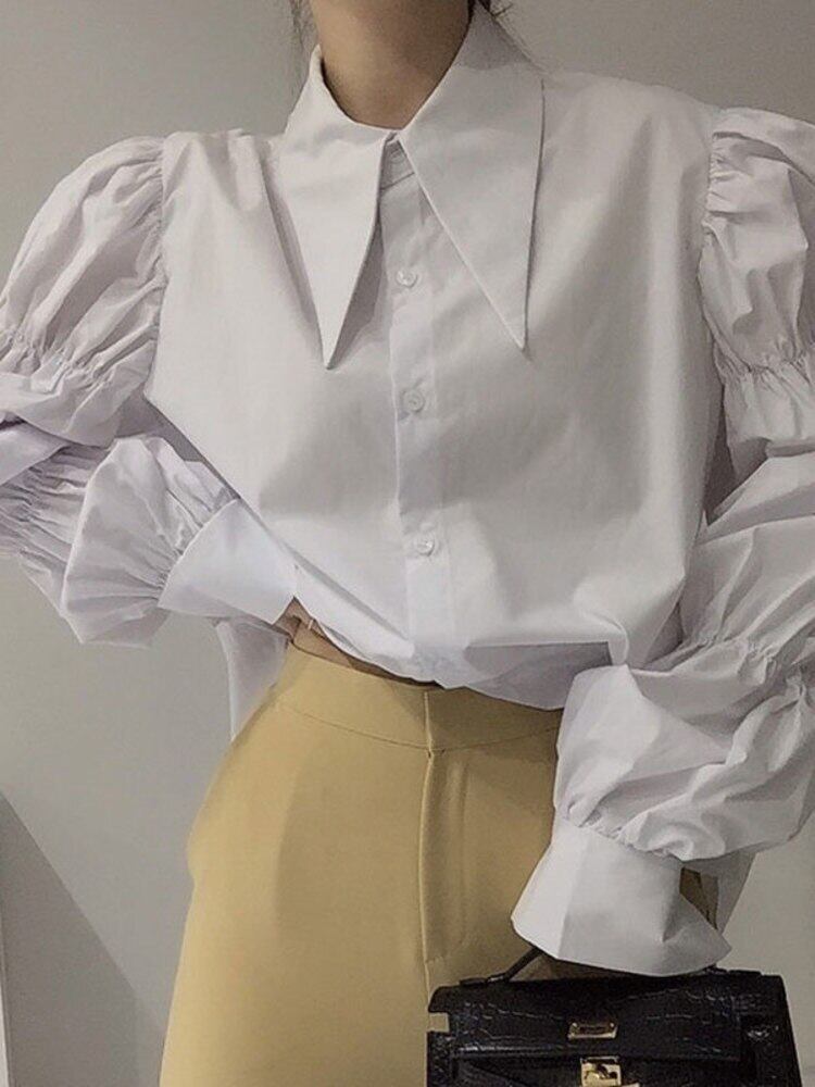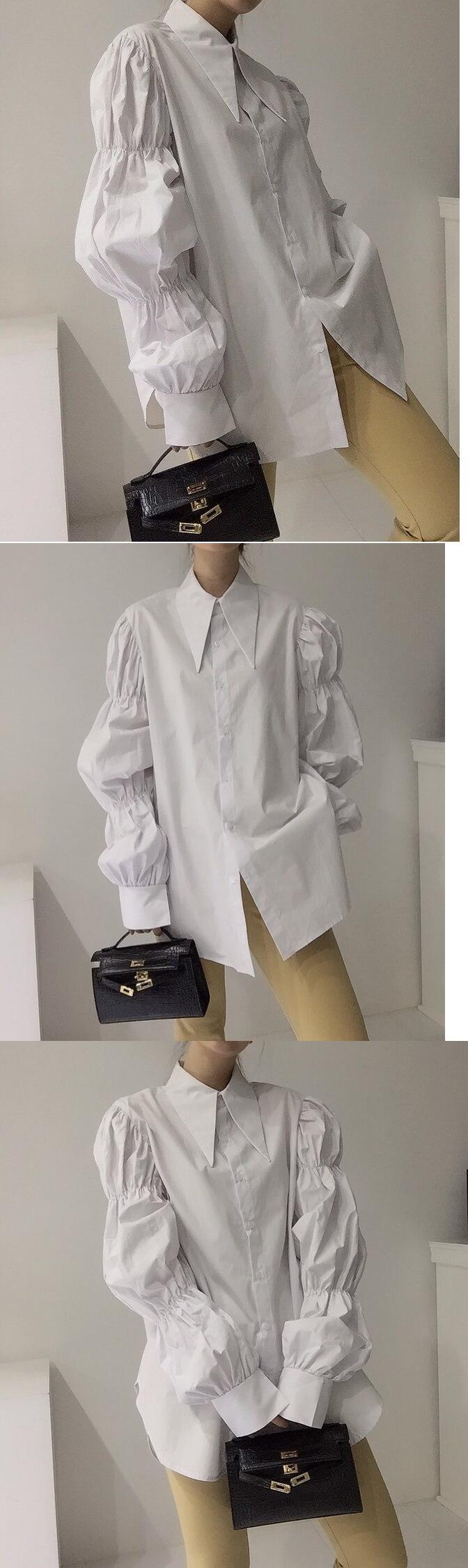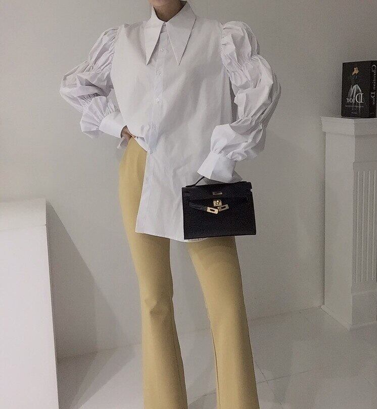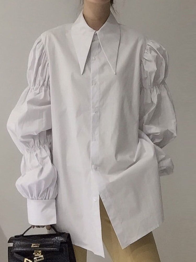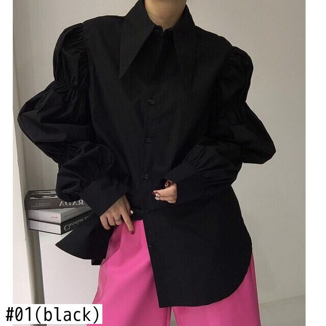 【EWQ】シックターンダウンカラー長袖シャツ レディース 春 プリーツ パフスリーブ トップス ルーズ ロング スプリング 春物