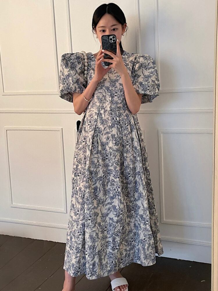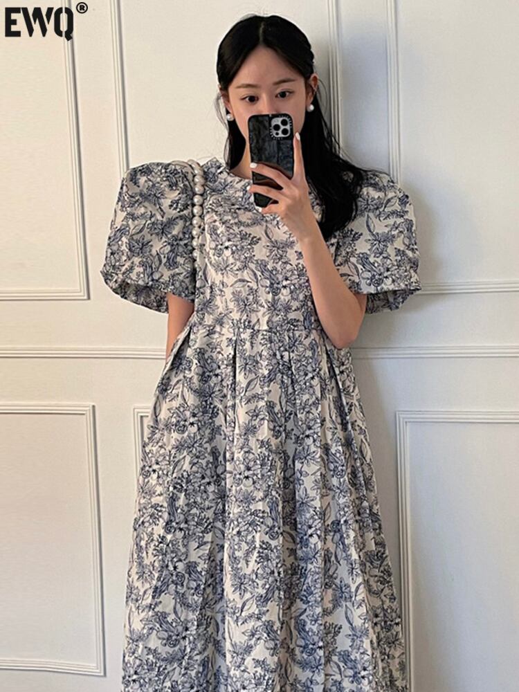 [EWQ] プリント プリーツ ウエスト ドレス バブル スリーブ コントラスト カラー O ネック ドレス サマー Vestido 16Y7612 夏物 Oネック