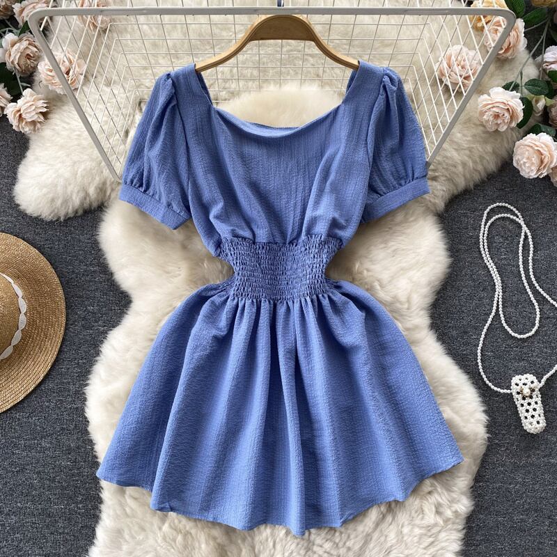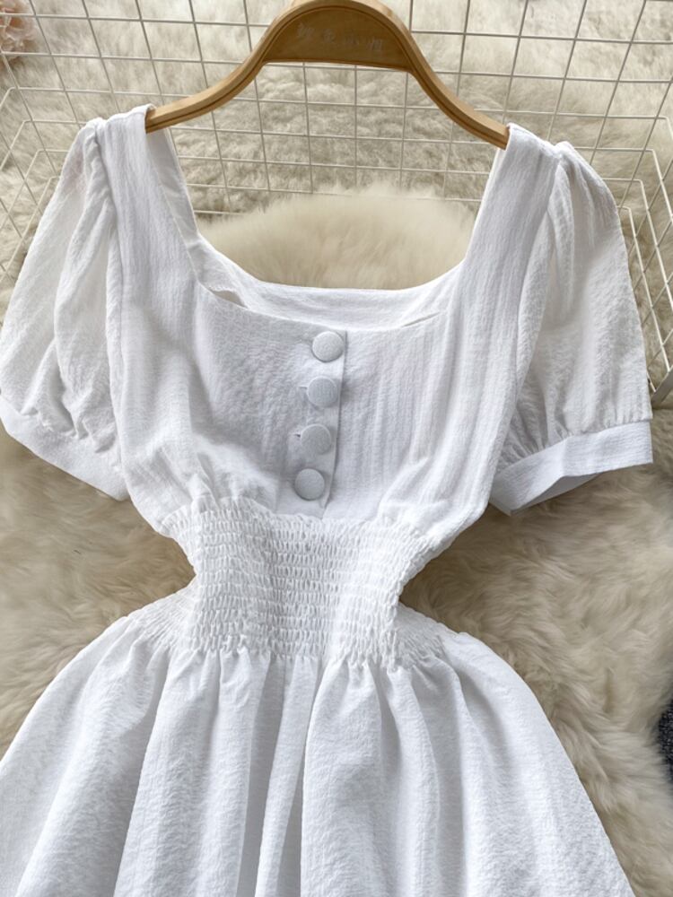 [EWQ] スクエアネック甘いプリーツ弾性ウエスト ドレス夏シックボタン半袖ミニ ドレス 16Y7246 ショート ハーフスリーブ エラスティック 伸縮 大人ガーリー スウィート キュート カジュアル サマー 夏物 スクウェア