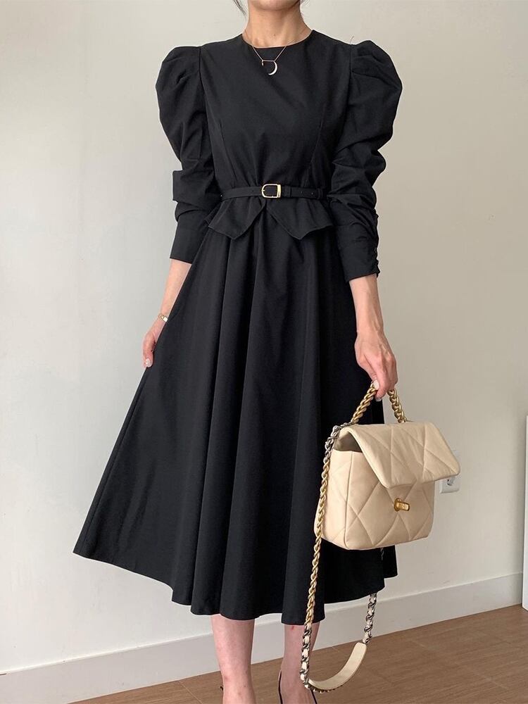 【EWQ】ラウンドネック ウエストステッチ フェイクツーピース プリーツ ロングワンピース ベルト付き レディース シック 春 スプリング 春物 ハーネス Oネック