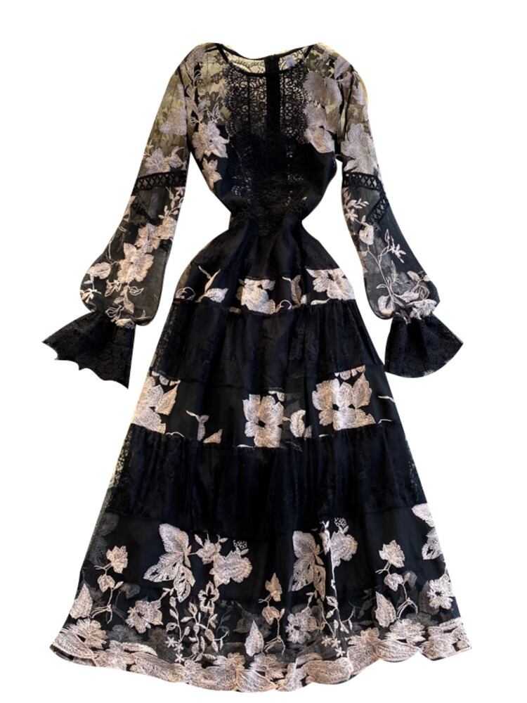[EWQ] 夏中空アウト ロング フレア スリーブ マキシ ドレス滑走路チュール メッシュ パッチワーク ピンク花刺繍ドレス 6Y186 レッド フレアスリーブ サマー 夏物 花柄