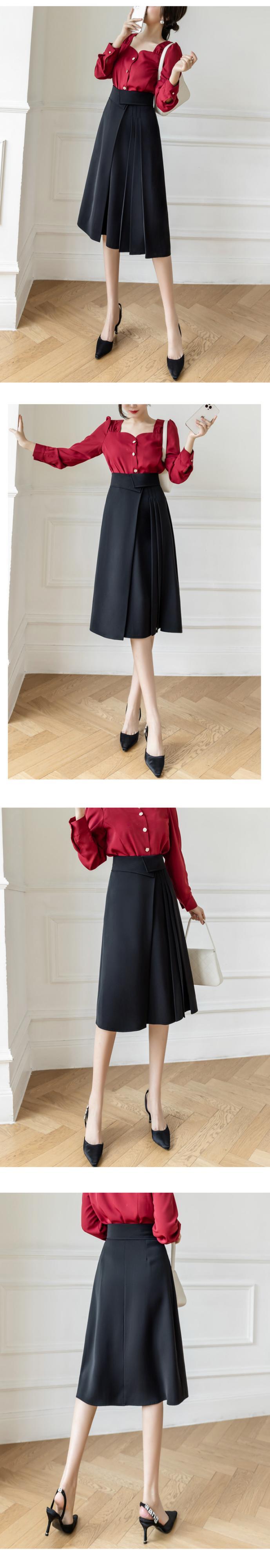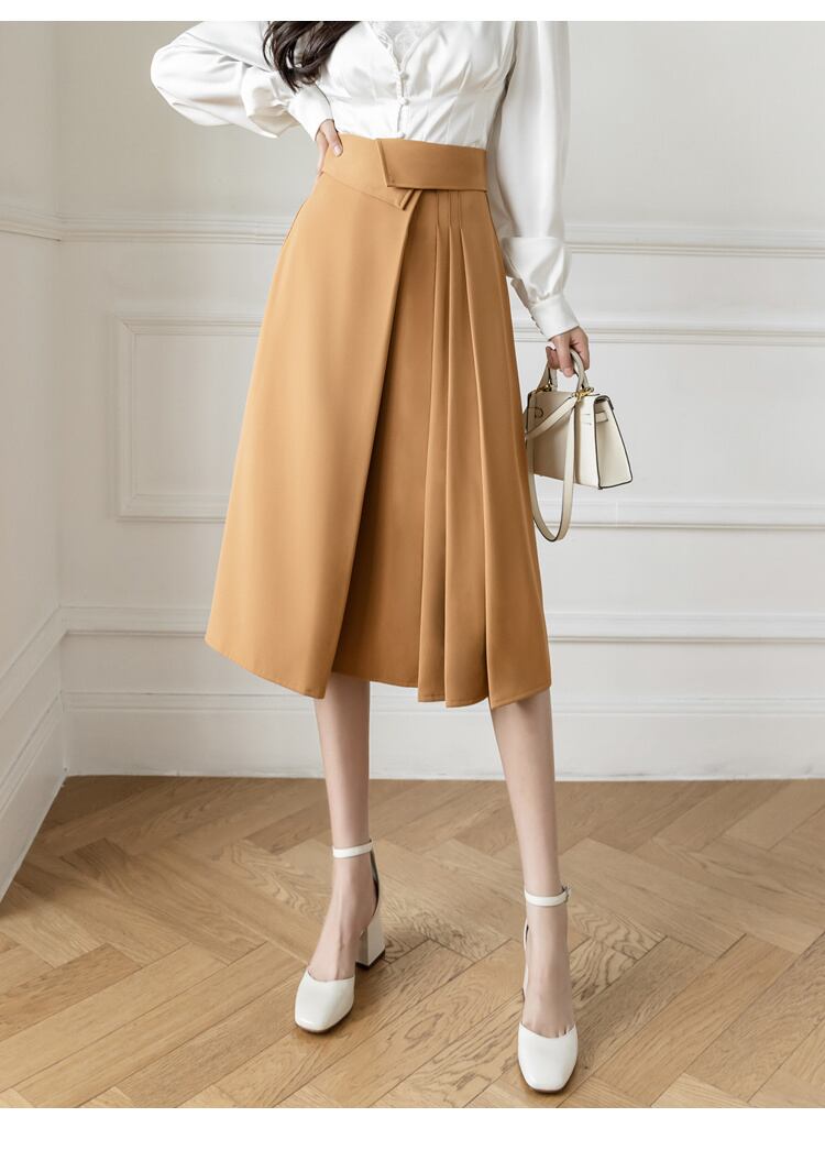 [EWQ] 不規則スプライシングプリーツ シック A ライン スカート春夏無地ミッドカーフ スカート 16Y6 スプリング 春物 サマー 夏物 Aライン ソリッドカラー