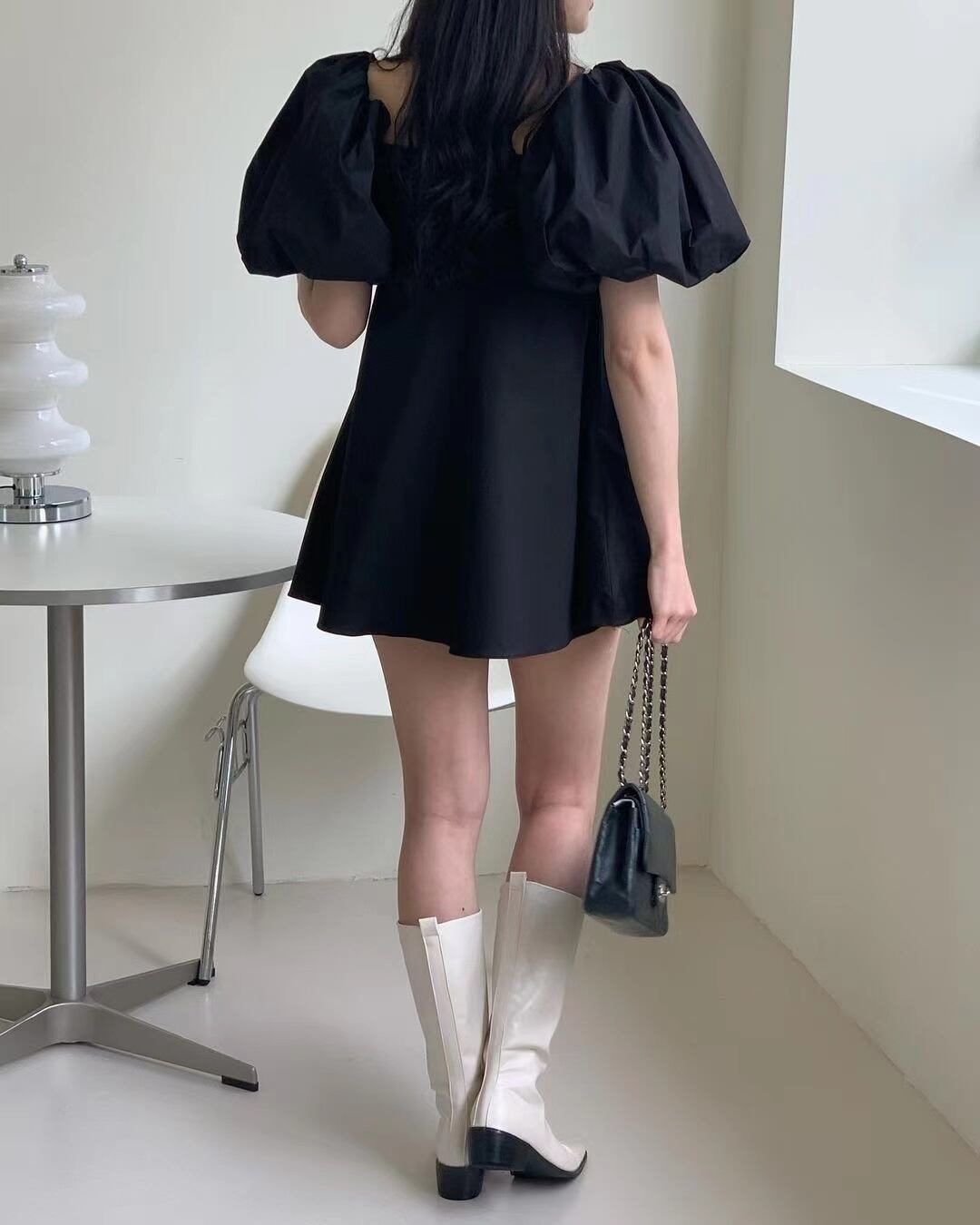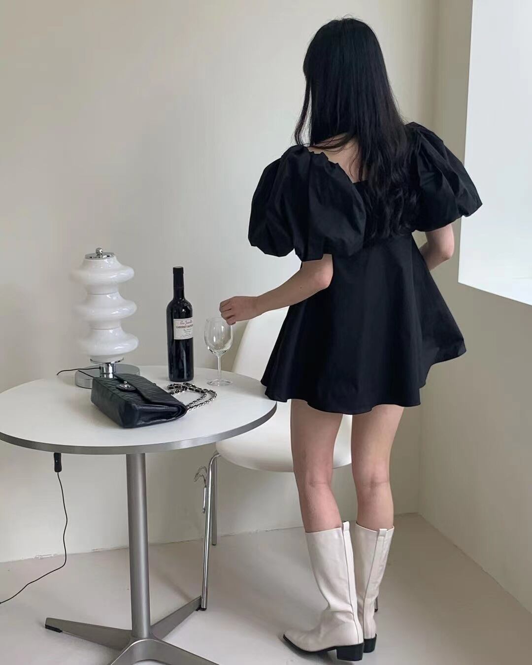 [EWQ] シックレトロ スリム スクエア カラー ルーズ ランタン スリーブ ブラック スモール ドレス レディース サマー 16Y370 ランタンスリーブ 夏物 スクウェア