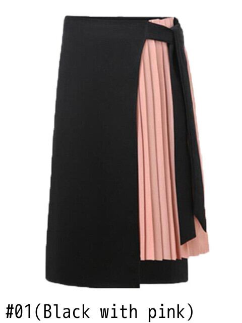【EWQ】レディースカラーコントラストレースアップAラインスカートプリーツサイドスプリットイレギュラーミッドカーフスカート春夏潮 スプリング 春物 サマー 夏物