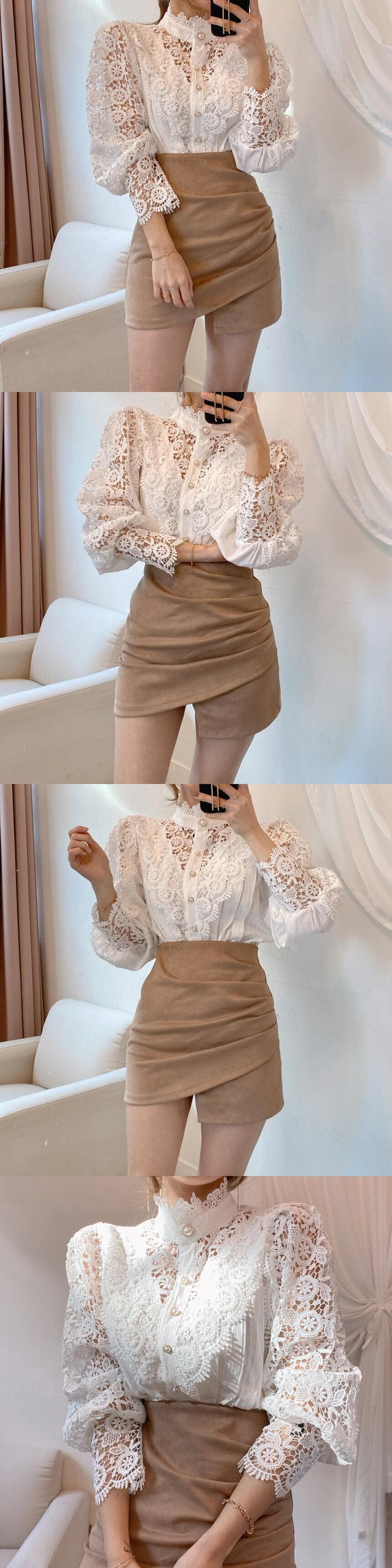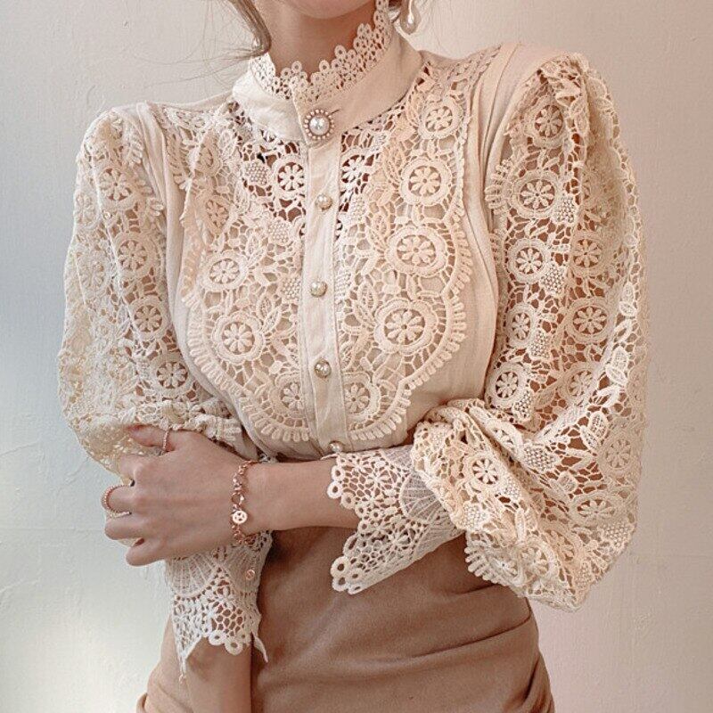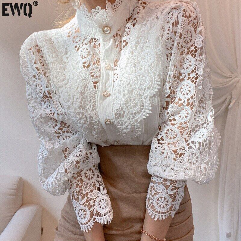 【EWQ】レディース レースホック 花中空シャツ スタンドカラー パッチワーク 長袖 春秋 トップス 13 ロング スプリング 春物 オータム 秋物 フラワーデザイン