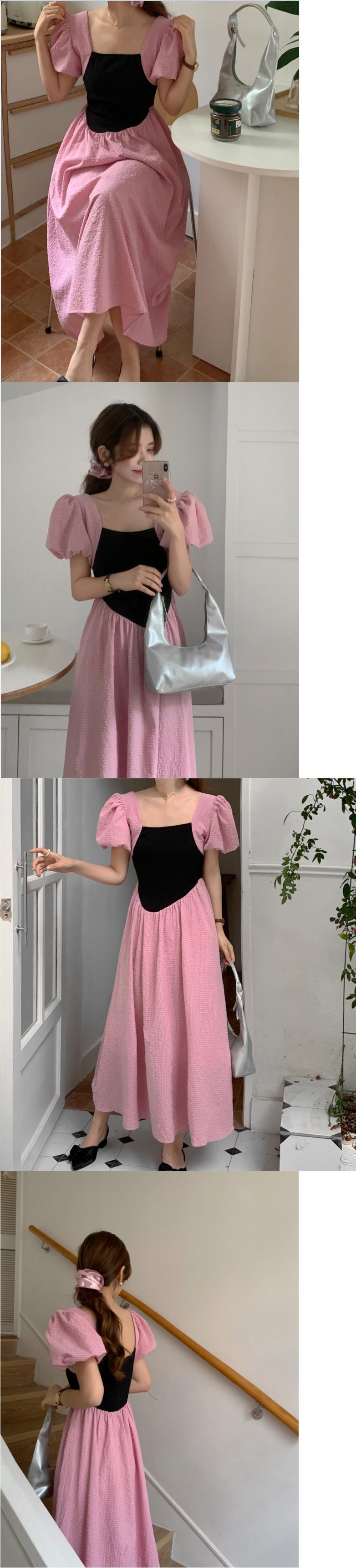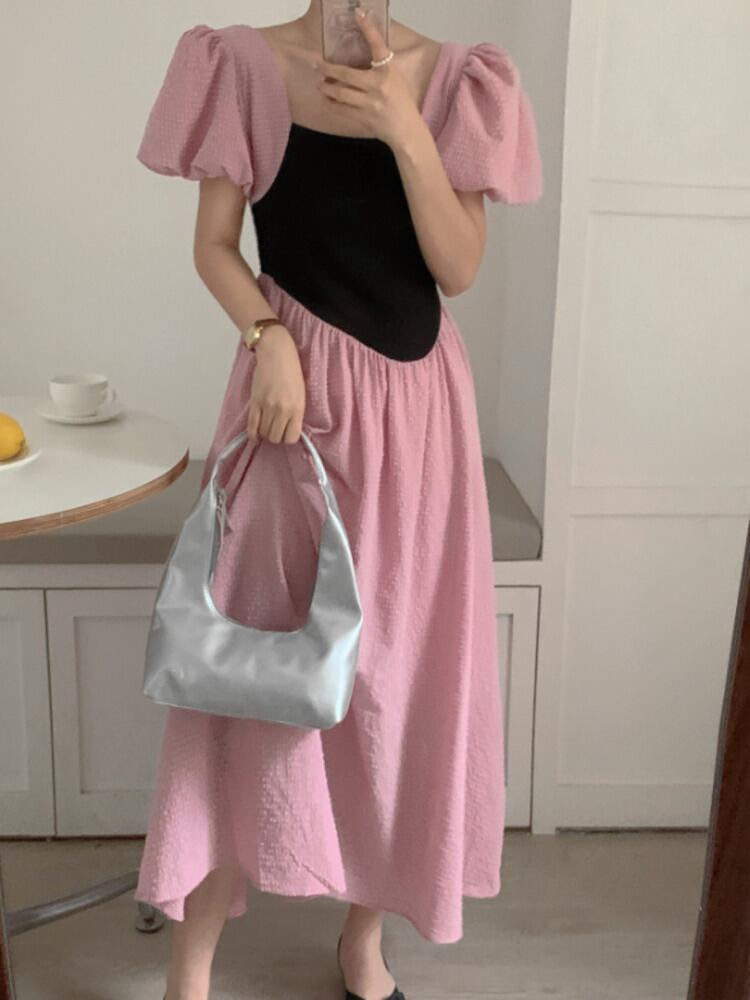 [EWQ] スクエア ネック コントラスト スプライス ドレス パフ スリーブ パッチワーク ドレス夏 Vestido 417 レッド サマー 夏物 スクウェア