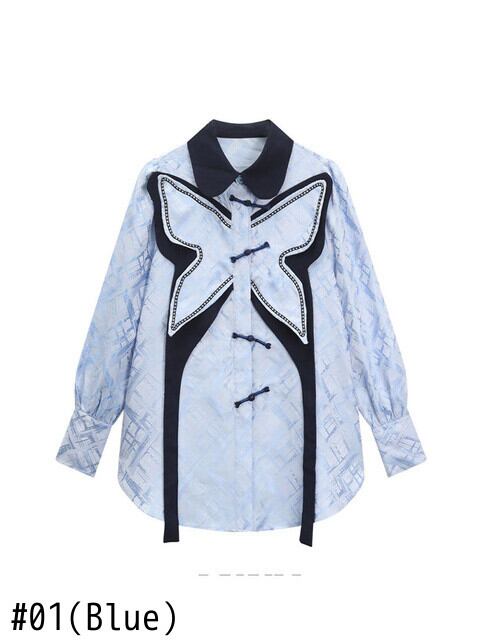 [EWQ] ブルー ブラウス ボウ デコレーション シャツ レディース 春 秋 長袖 ボタンアップ タイド トップス 16Y8109h5 ロング リボン スプリング 春物 オータム 秋物