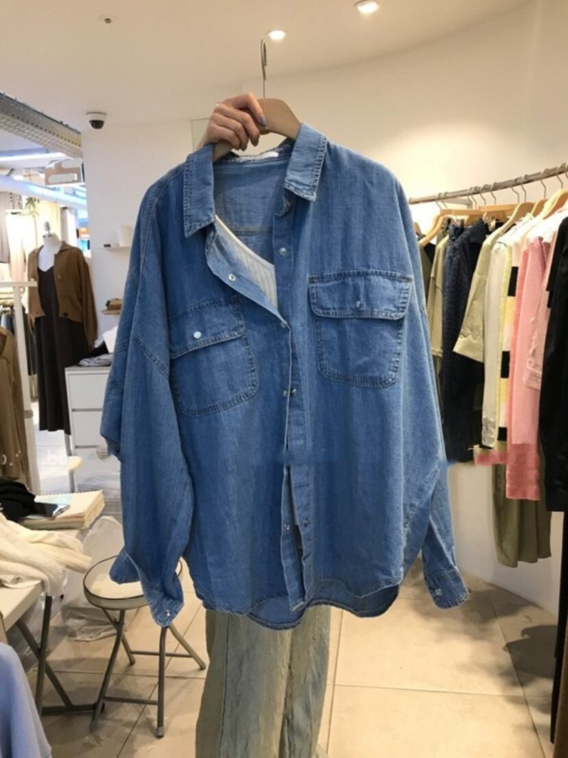 [EWQ] ポケット シングル ブレスト デニム シャツ長袖ブルー トップ春秋トレンド ブラウス 6647 ロング スプリング 春物 オータム 秋物