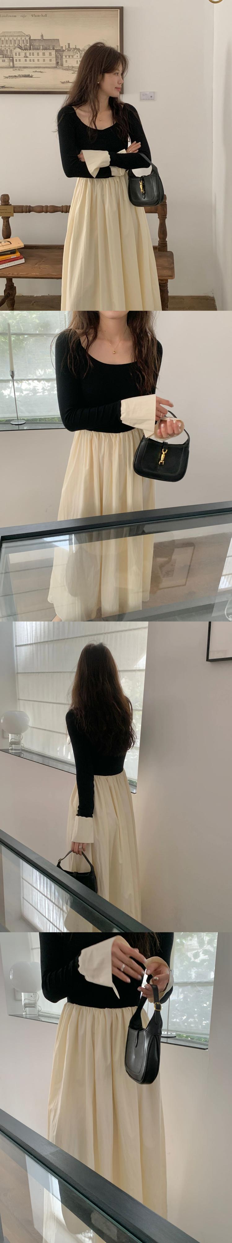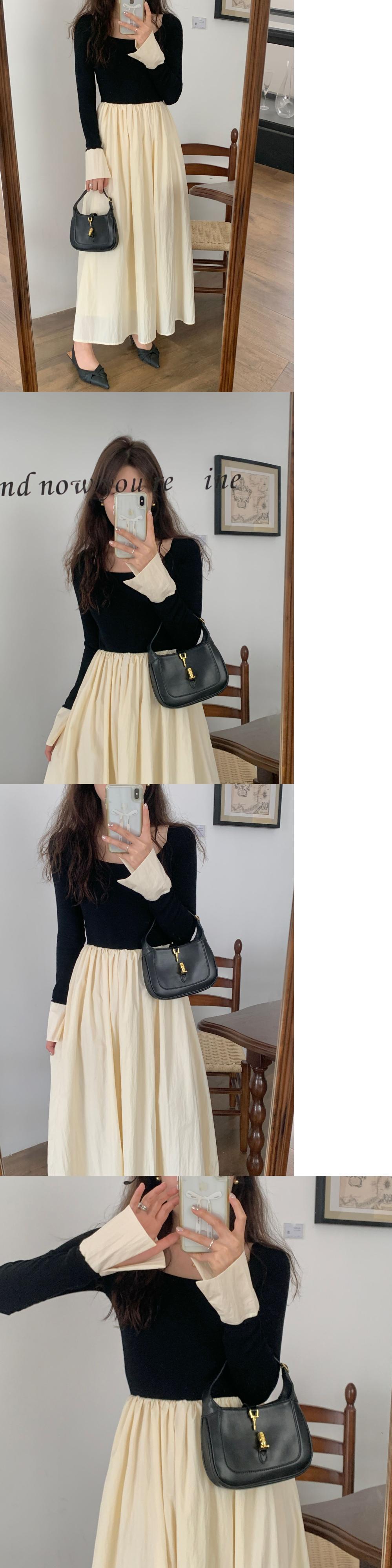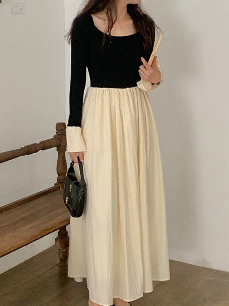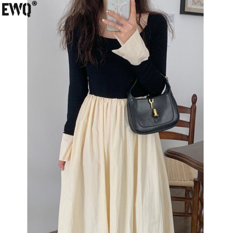 [EWQ] コントラスト長袖プリーツスプライシングドレスパッチワーク O ネックマキシドレス春秋 Vestido 16Y6971 ロング スプリング 春物 オータム 秋物 Oネック