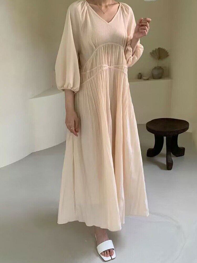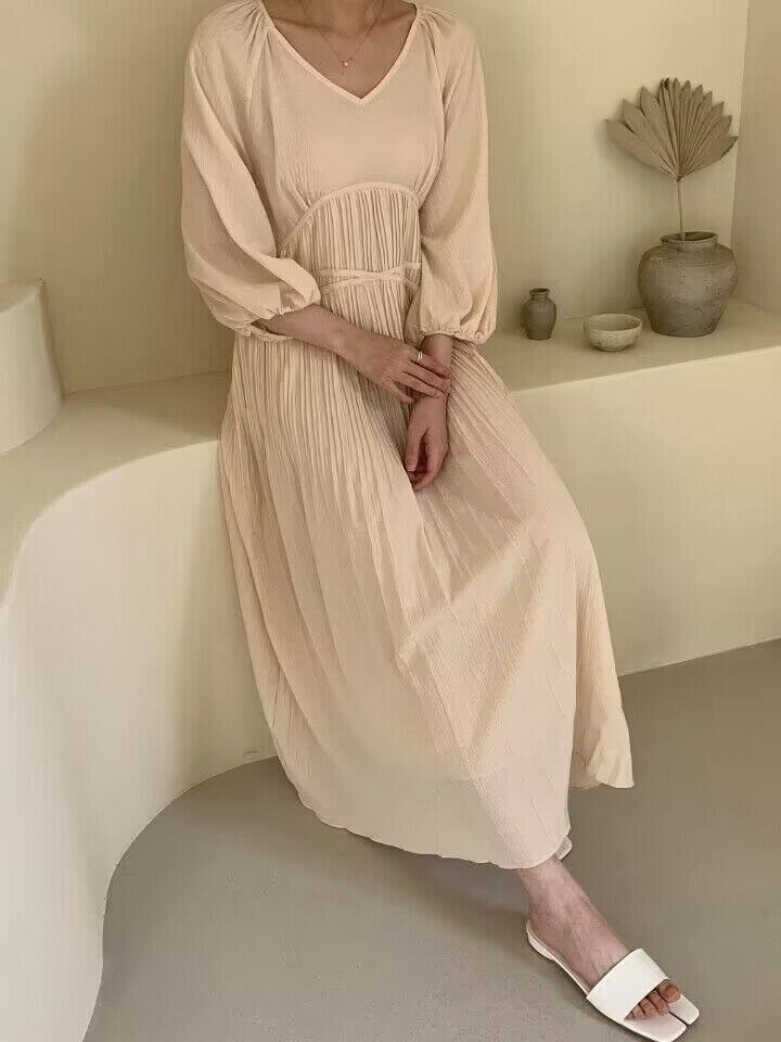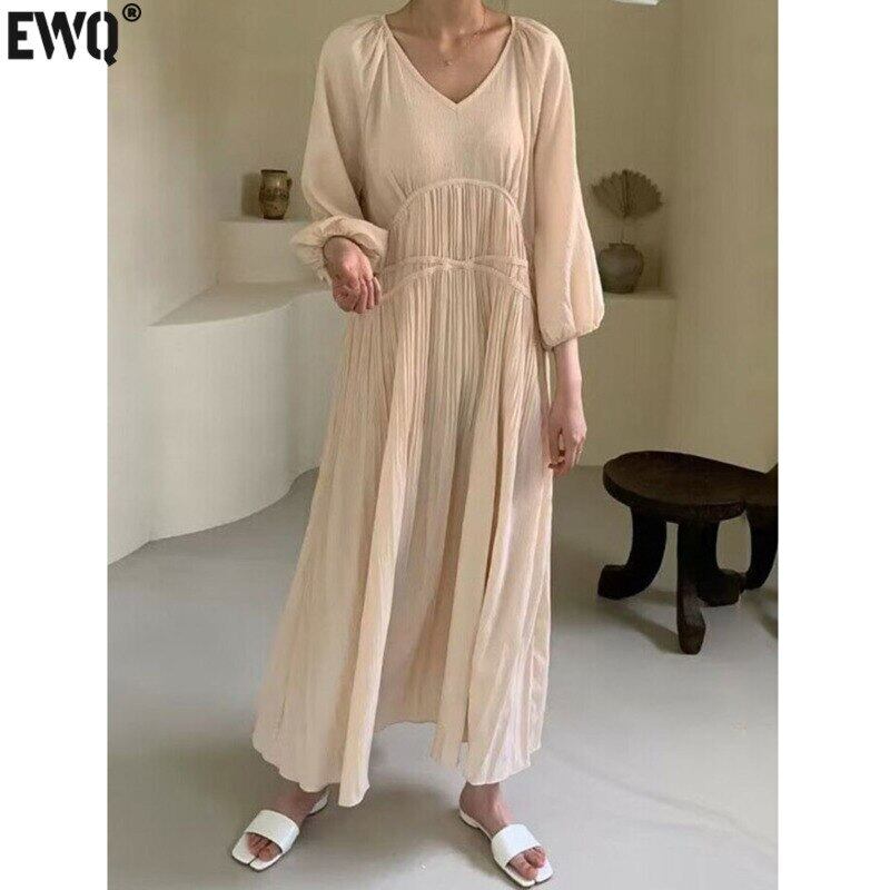 [EWQ] V ネック プリーツ ウエスト ドレス長袖マキシ ドレス春秋トレンド Vestido 752 ロング スプリング 春物 オータム 秋物 Vネック