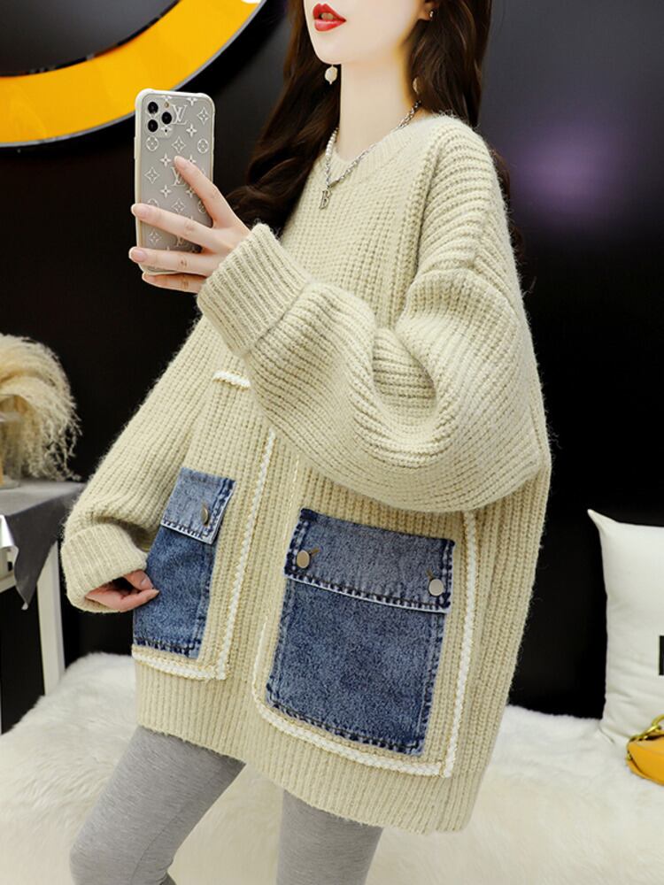 【EWQ】デニム ポケットつぎ レディース ニットセーター 春秋潮 長袖 パッチワーク ニット 16Y610 ロング スプリング 春物 オータム 秋物