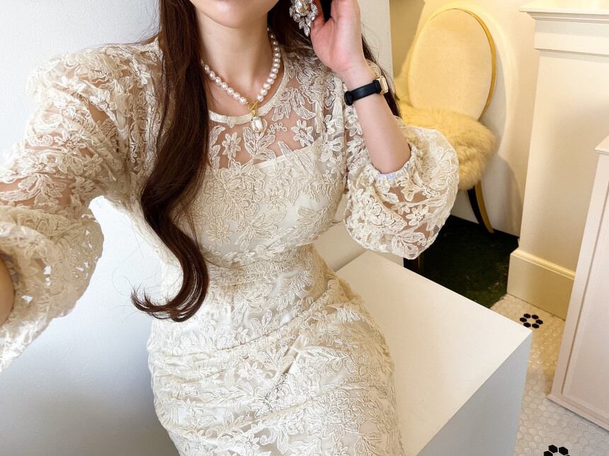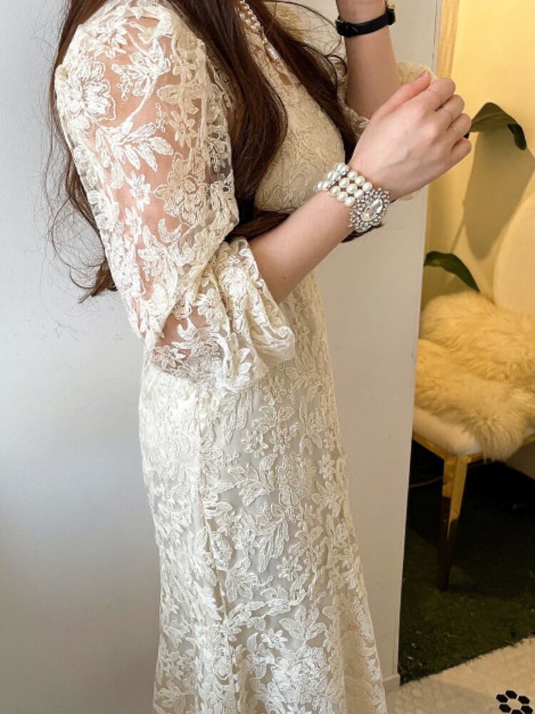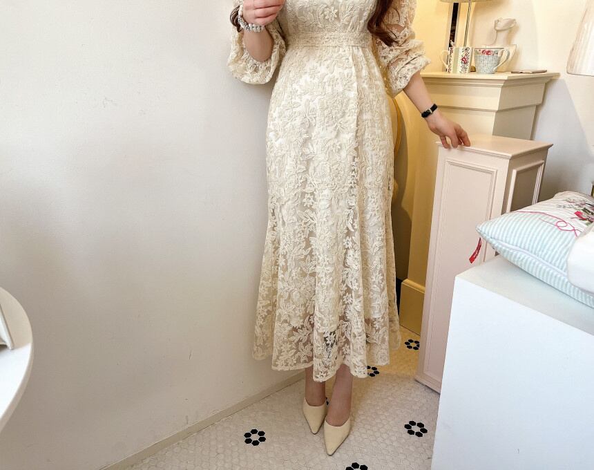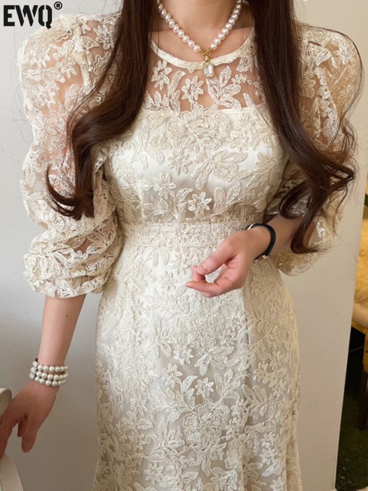[EWQ] フック フラワー パフ スリーブ ドレス レースアップ無地 O ネック透視ドレス夏 Vestido サマー 夏物 Oネック ソリッドカラー フラワーデザイン