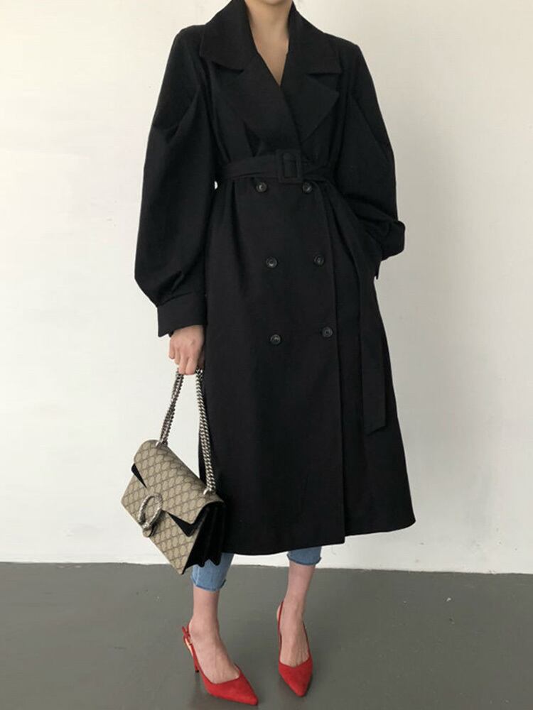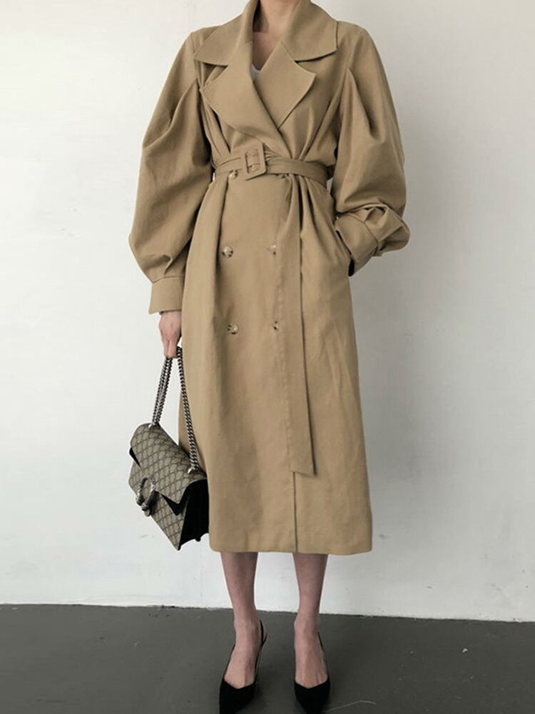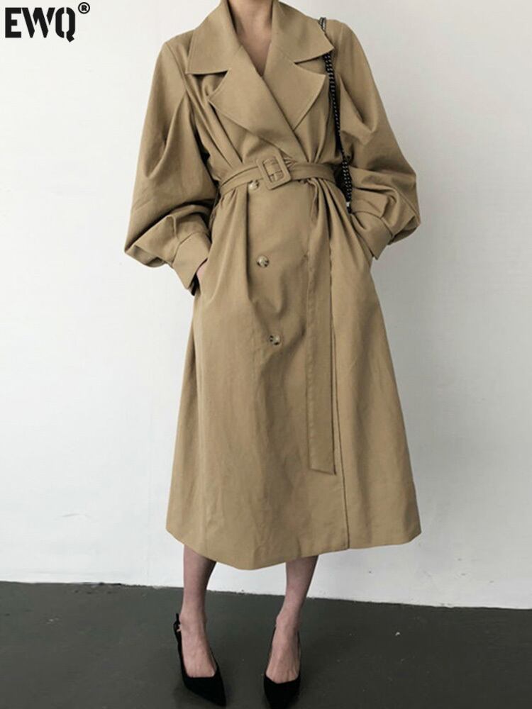 【EWQ】春物 長袖 ターンダウンカラー ダブルブレスト 無地 ルーズ ミッドロング ウインドブレーカー オーバーコート ベルト付 16Y1846 スプリング ハーネス ソリッドカラー