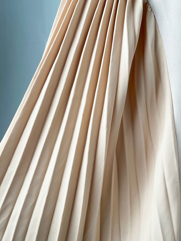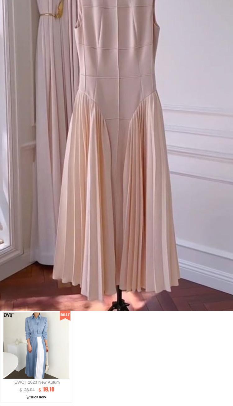 【EWQ】Oネック ステッチライン レディース パーティードレス 綺麗めプリーツドレス パッチワーク スリム アプリコットカラー ローブ 夏 サマー 夏物