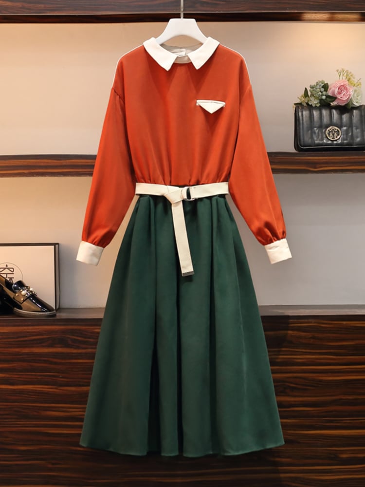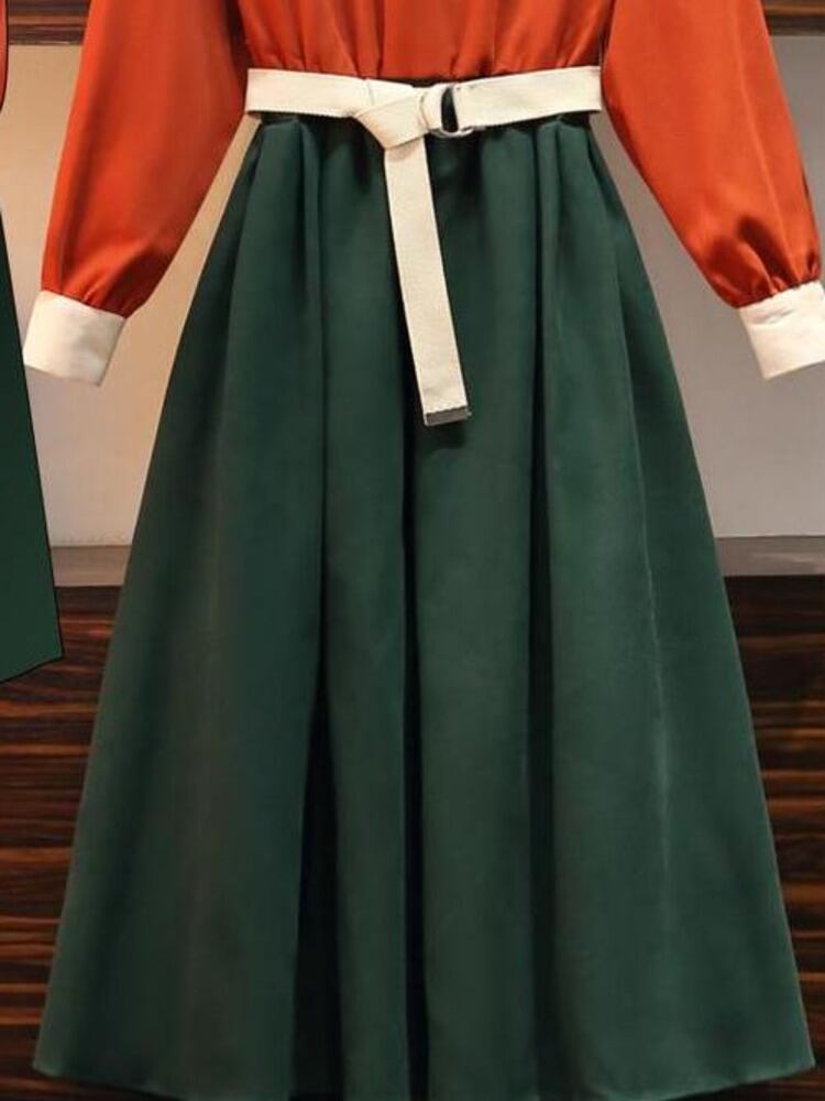 【EWQ】エイブルカラーコントラストスプライシングレディースAラインドレス春秋潮ベルトVestido Party Redo 16Y6027 スプリング 春物 オータム 秋物 ハーネス