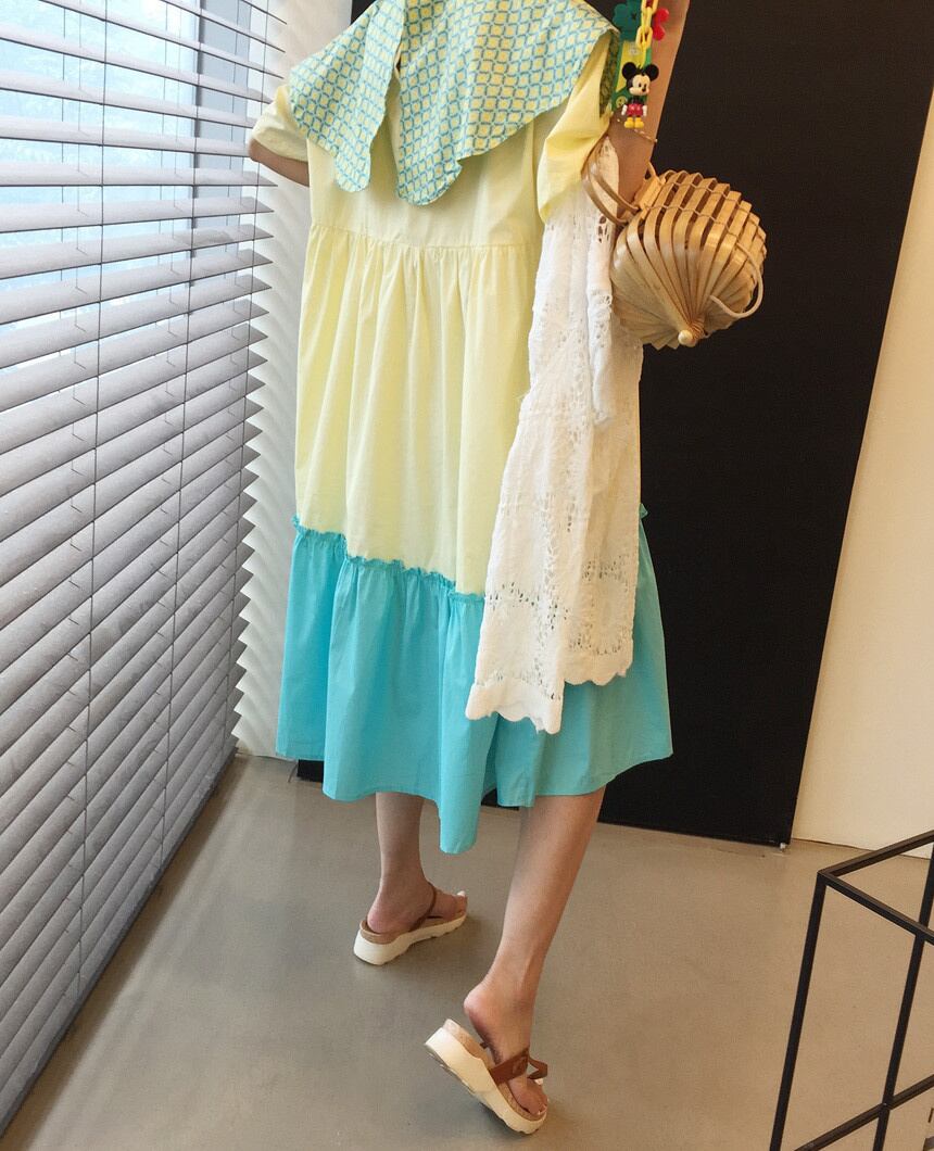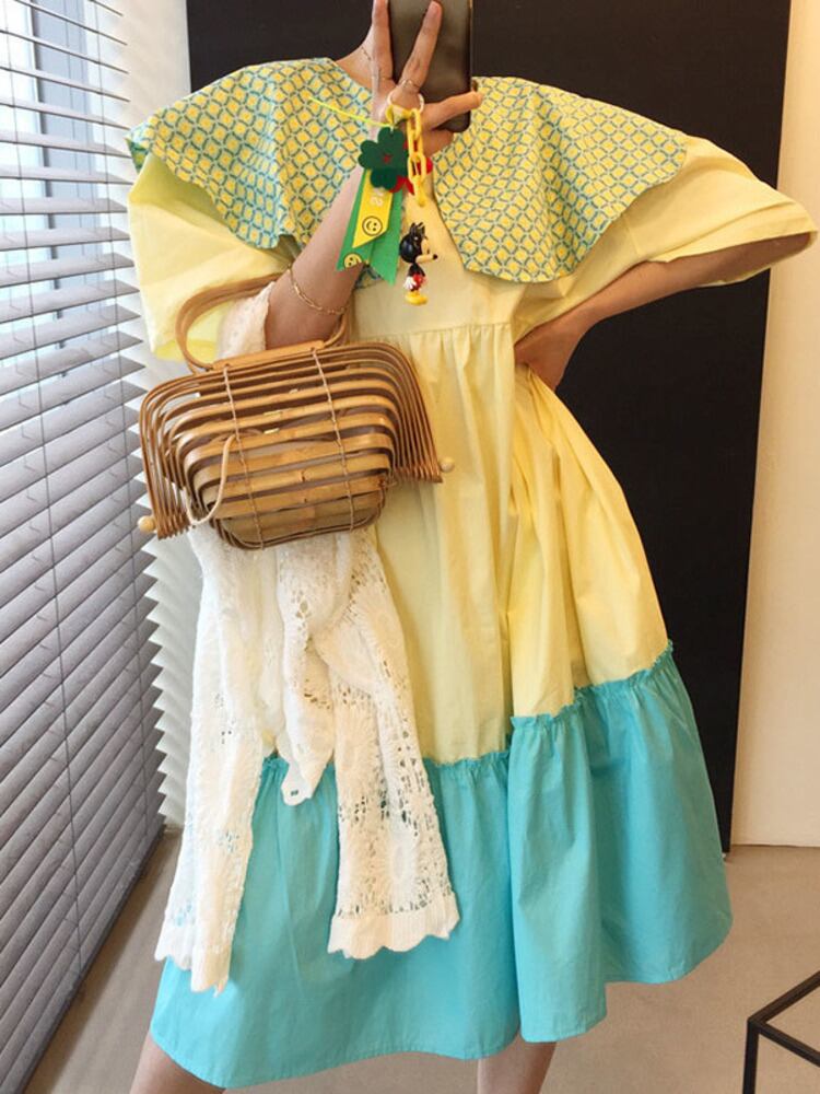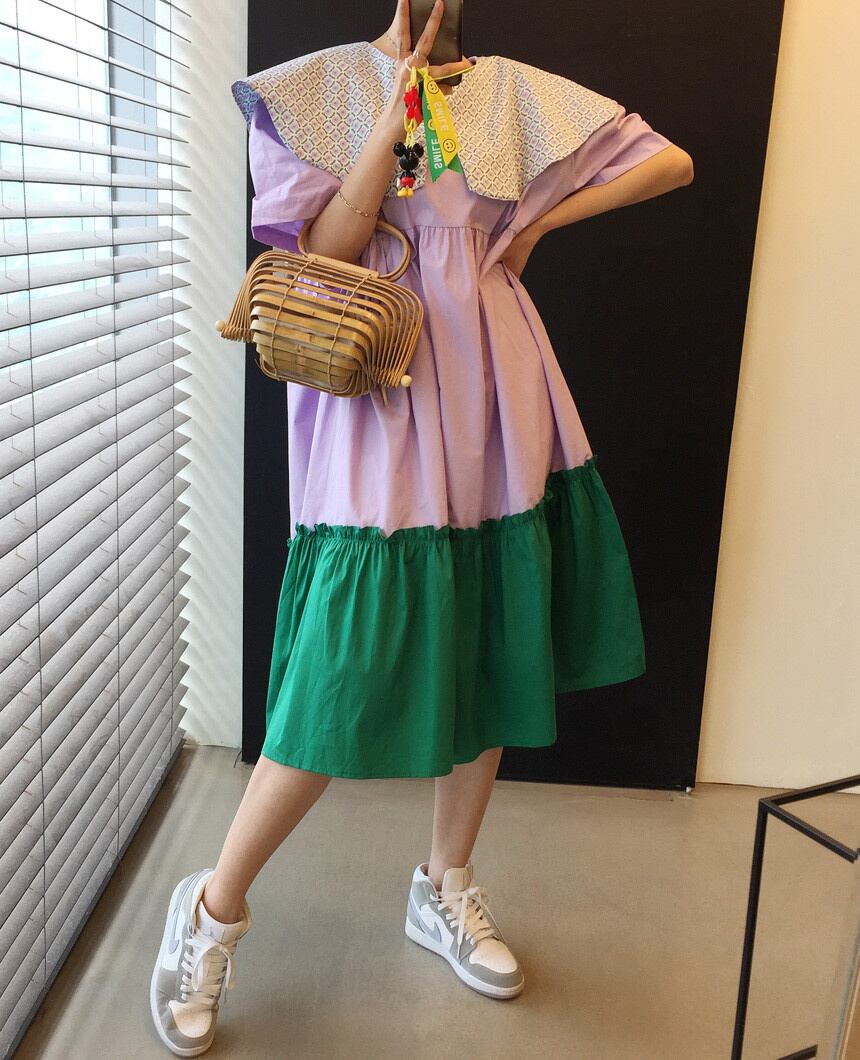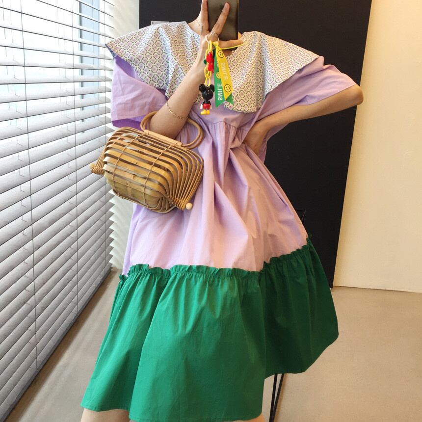[EWQ] コントラスト ピーターパン カラー ドレス ショートスリーブ フリル スプライス ルーズ 因果パッチワーク ドレス 夏潮 Vestido 400 サマー 夏物 ショーツ ブルマー