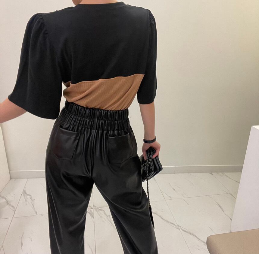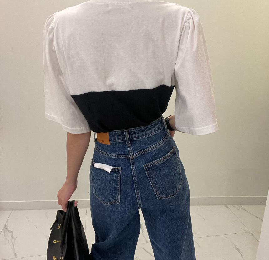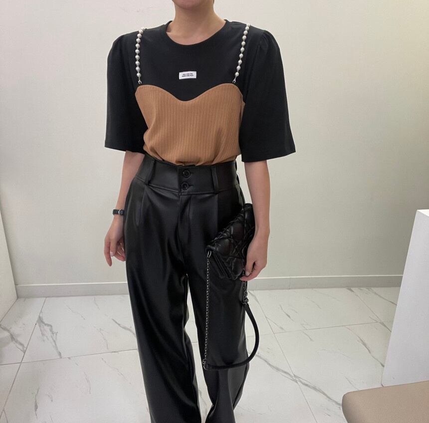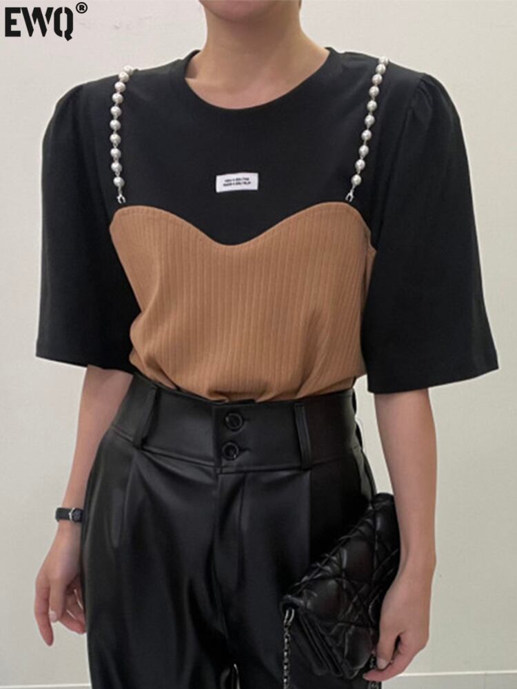 [EWQ] パール コントラスト カラー スプライシング フェイク ツーピース Tシャツ レディース 半袖 ルーズ Tシャツ トップス サマー タイド トップス ショート ハーフスリーブ 夏物 真珠