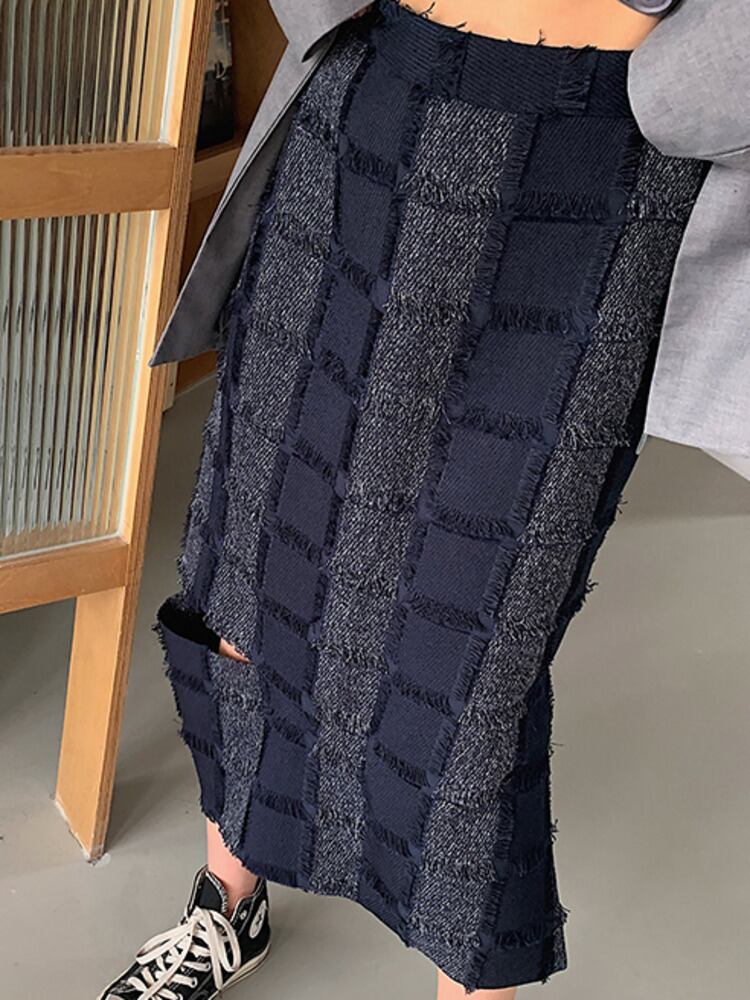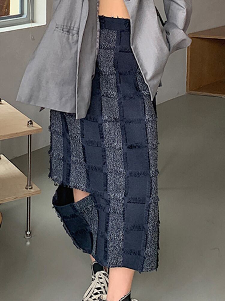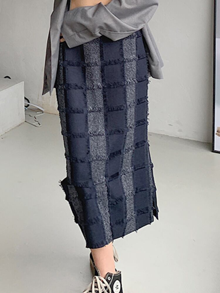 [EWQ] チェック柄コントラストホール A ラインスカートウエストミッドカーフスカート春夏 Tel Faldas スプリング 春物 サマー 夏物 Aライン