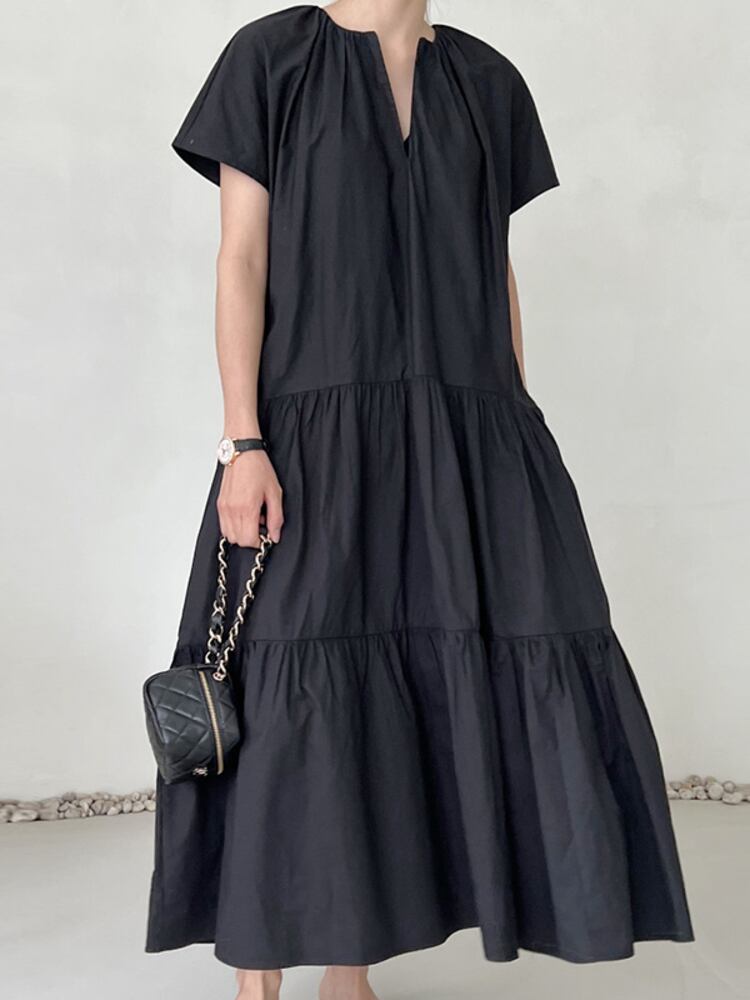 [EWQ] V ネック プリーツ ルーズ カジュアル ドレス 無地 半袖 パッチワーク ドレス 夏 潮 Vestidos 16Y8396 ショート ハーフスリーブ サマー 夏物 Vネック ソリッドカラー
