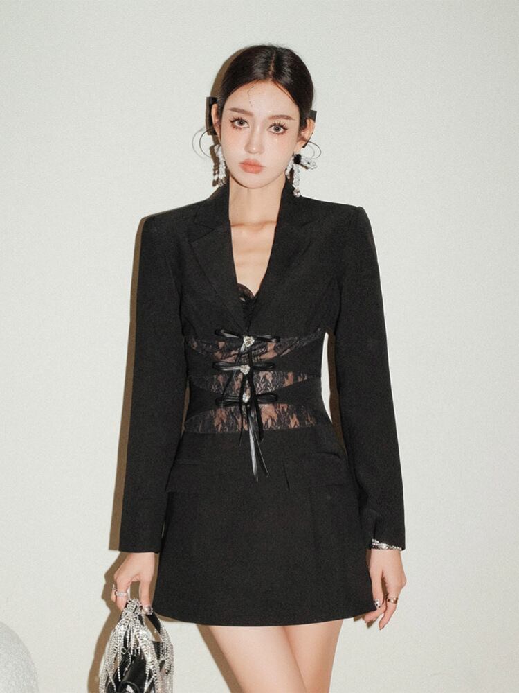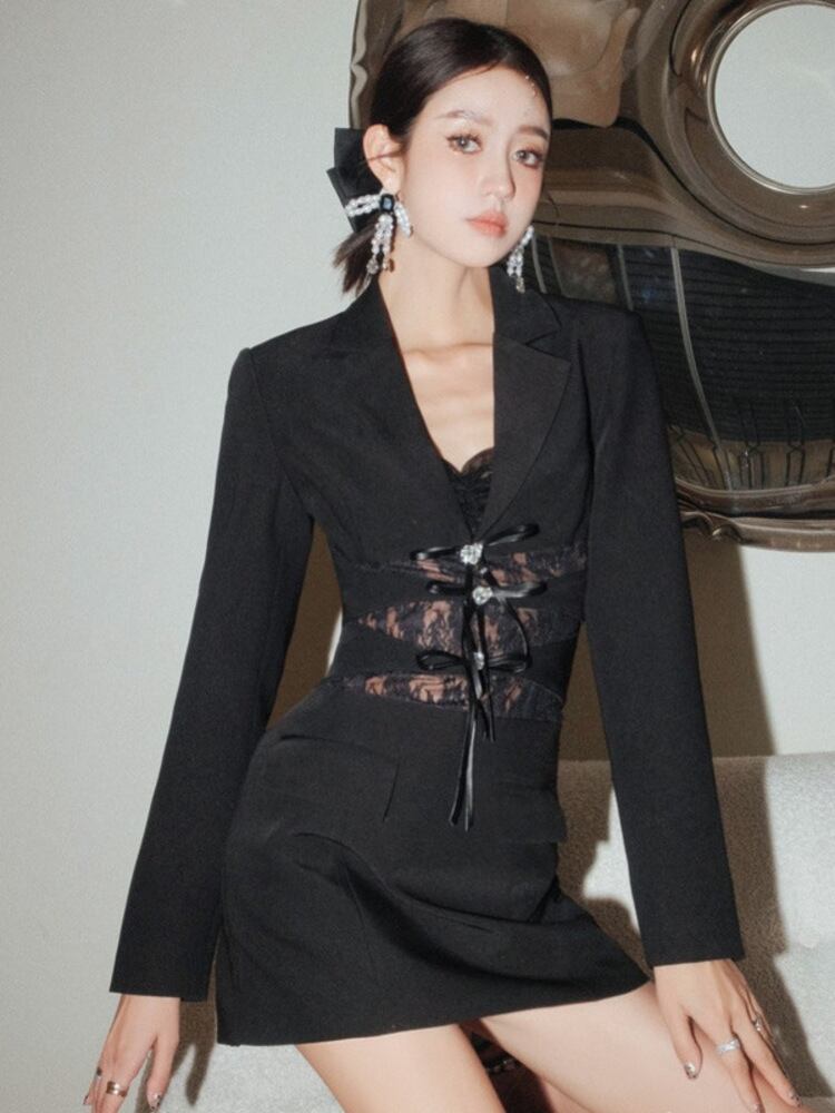 [EWQ] 無地レース パッチワーク ドレス気質 V ネック長袖ドレス秋 16Y3685 ロング オータム 秋物 Vネック ソリッドカラー