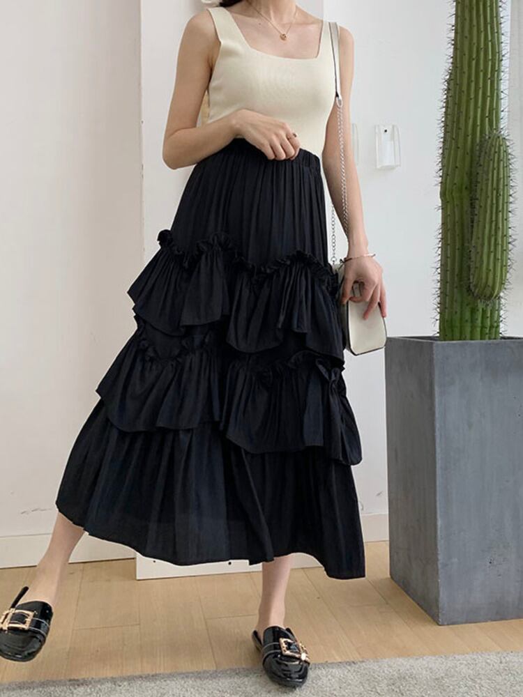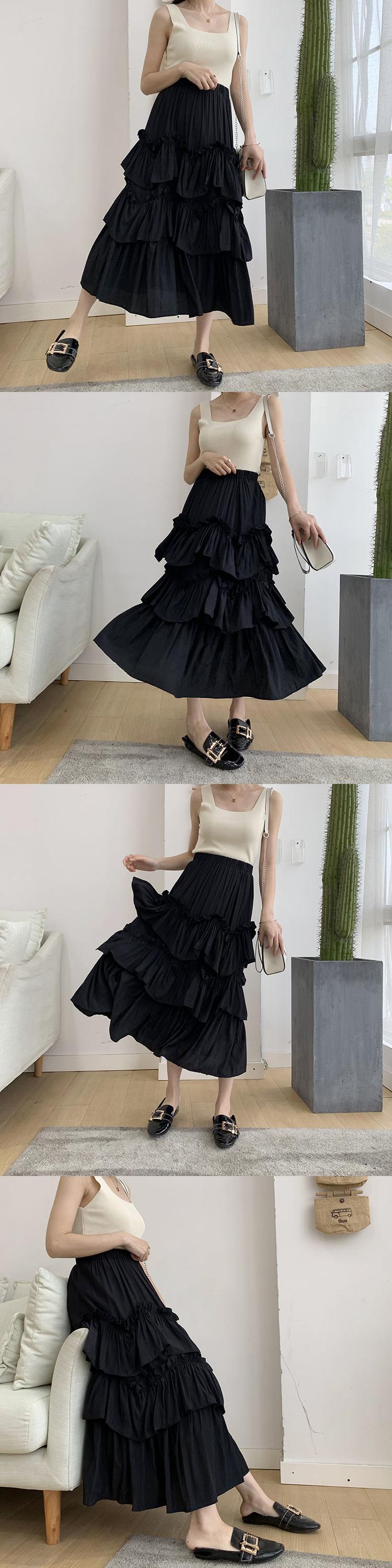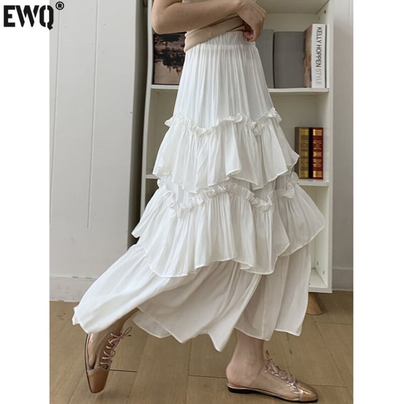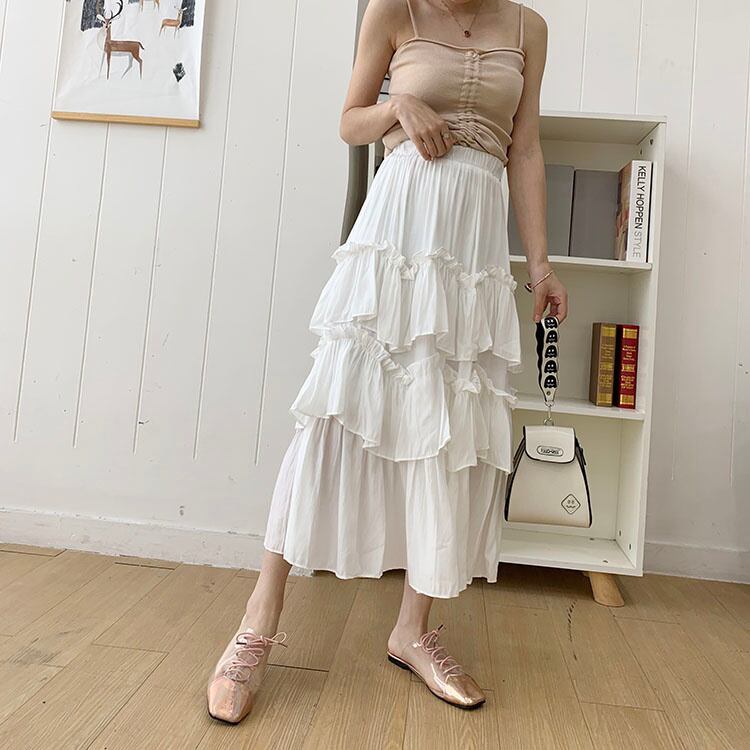 [EWQ] レディース ティアード プリーツ フリル スカート 無地 ウエストゴム Aライン スカート 春夏 ミッドカーフ ファルダス 16Y7078 レッド エラスティック 伸縮 スプリング 春物 サマー 夏物 ソリッドカラー