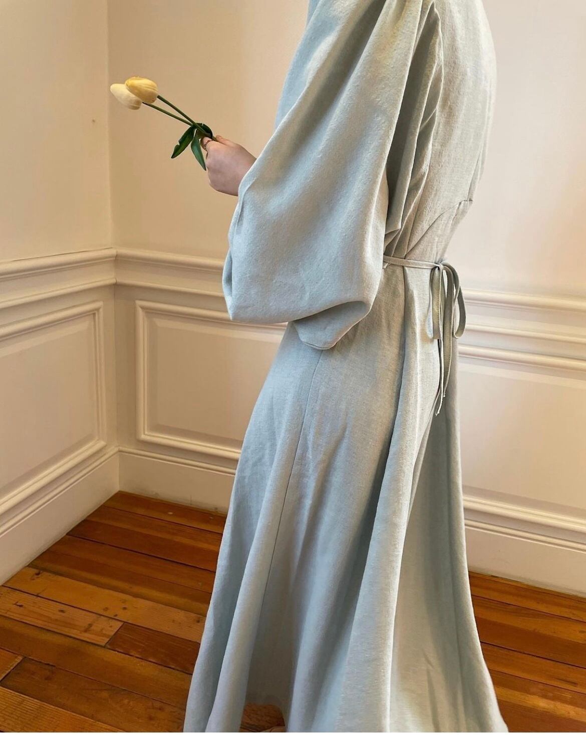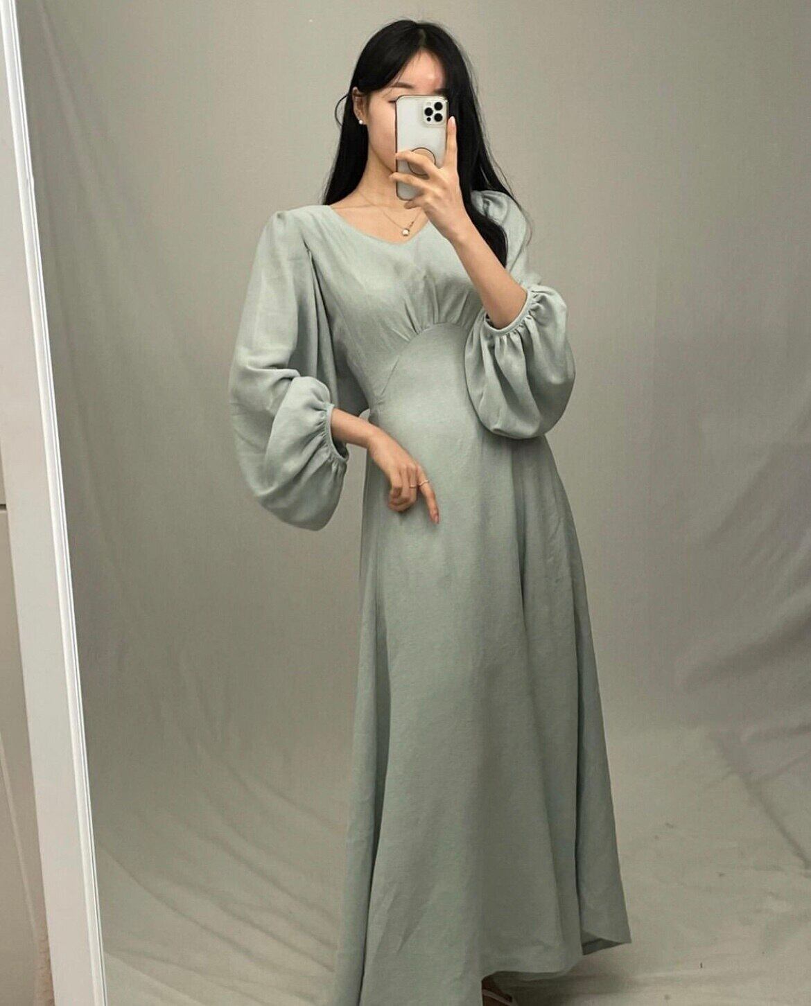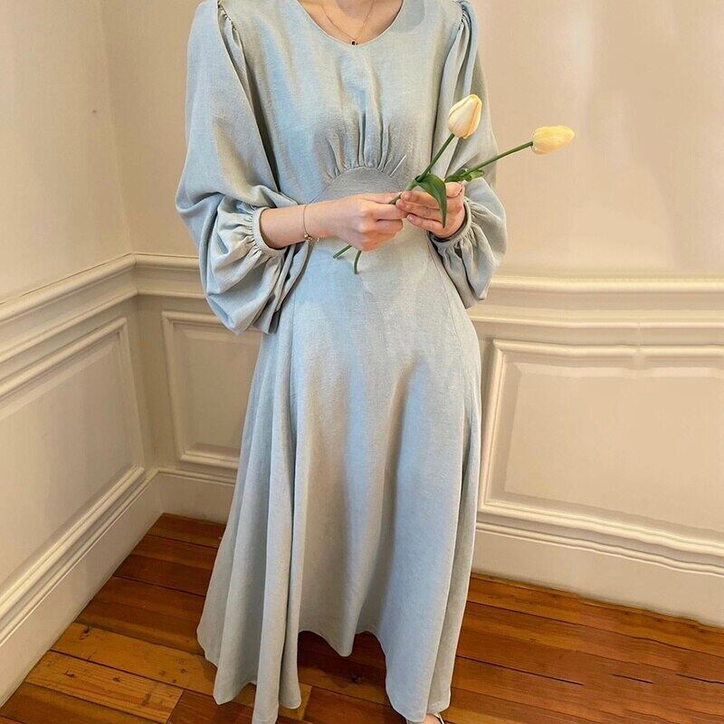 【EWQ】白 秋気質 薄手 Vネック レースアップ ウエストオーバーニー ロング 無地 ランタンスリーブワンピース 16E2942 ホワイト オータム 秋物 ソリッドカラー