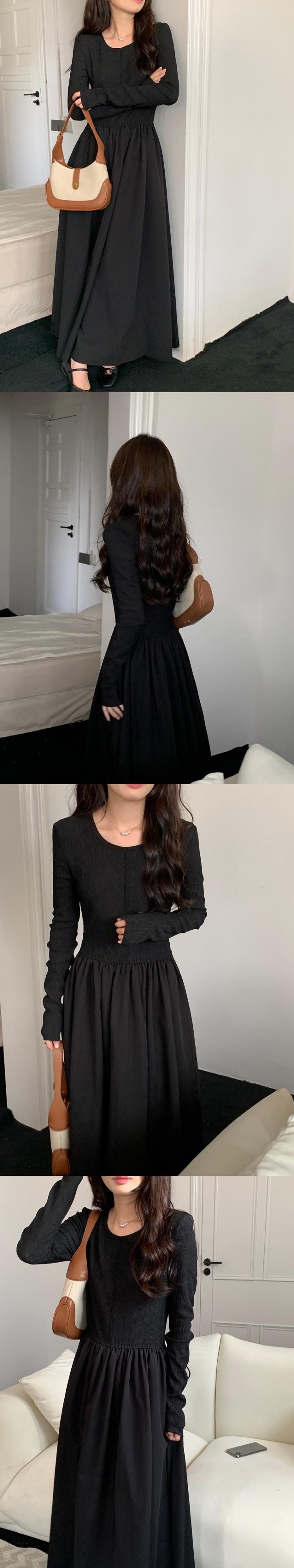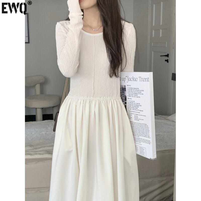 [EWQ] O ネック プリーツ スプライシング ドレス長袖無地ドレス春秋 Vestido 6765 ロング スプリング 春物 オータム 秋物 Oネック ソリッドカラー