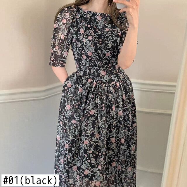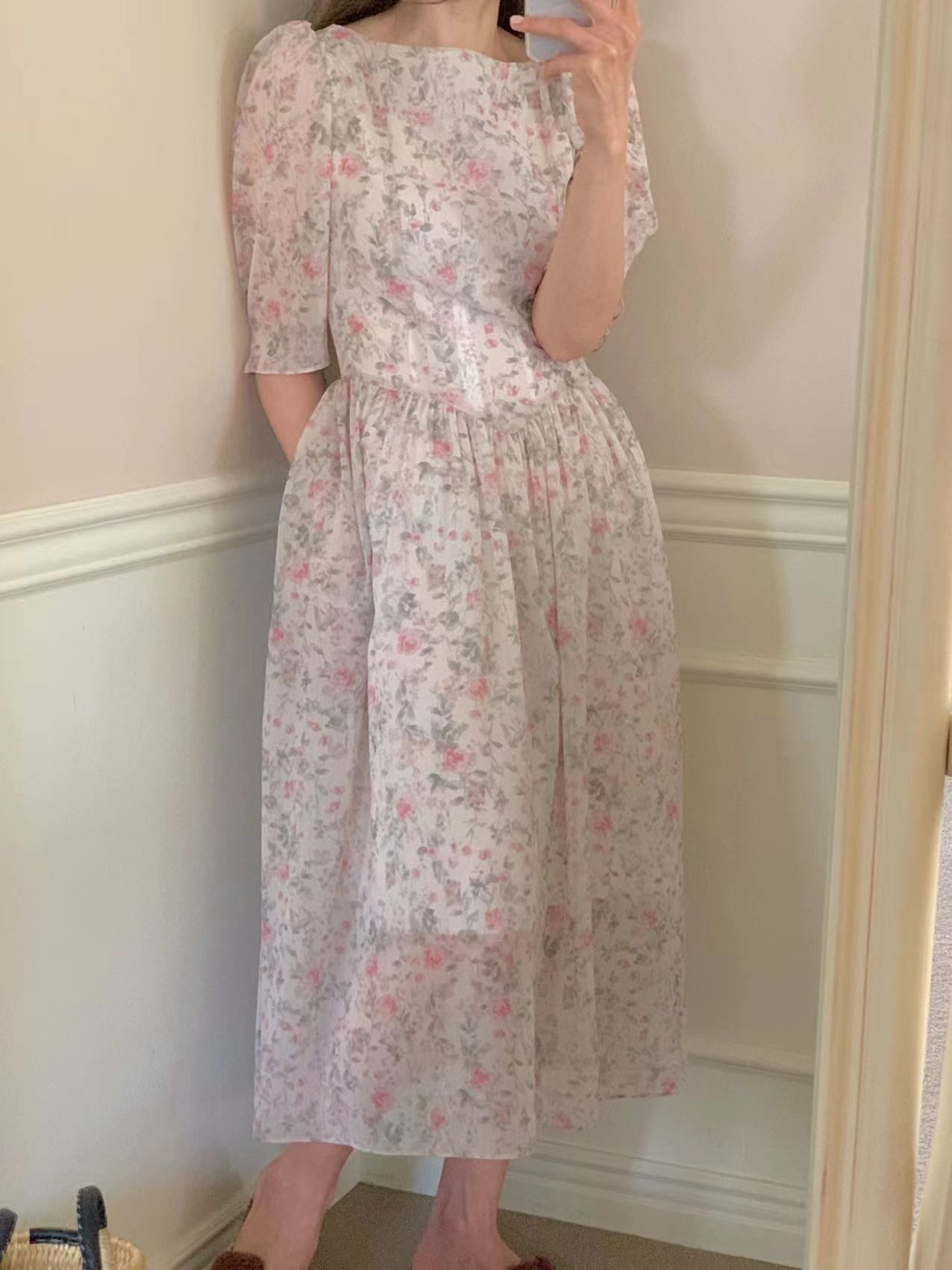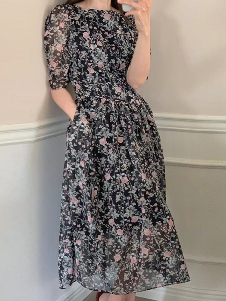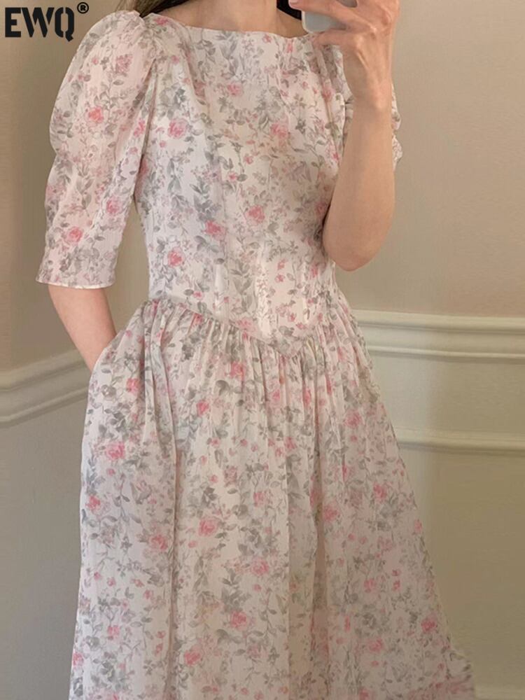 [EWQ] スウィート O ネック プリーツ ウエスト ドレス コントラスト プリント パフ スリーブ ミディ ドレス夏潮オールマッチ服 8298 大人ガーリー キュート カジュアル サマー 夏物 Oネック
