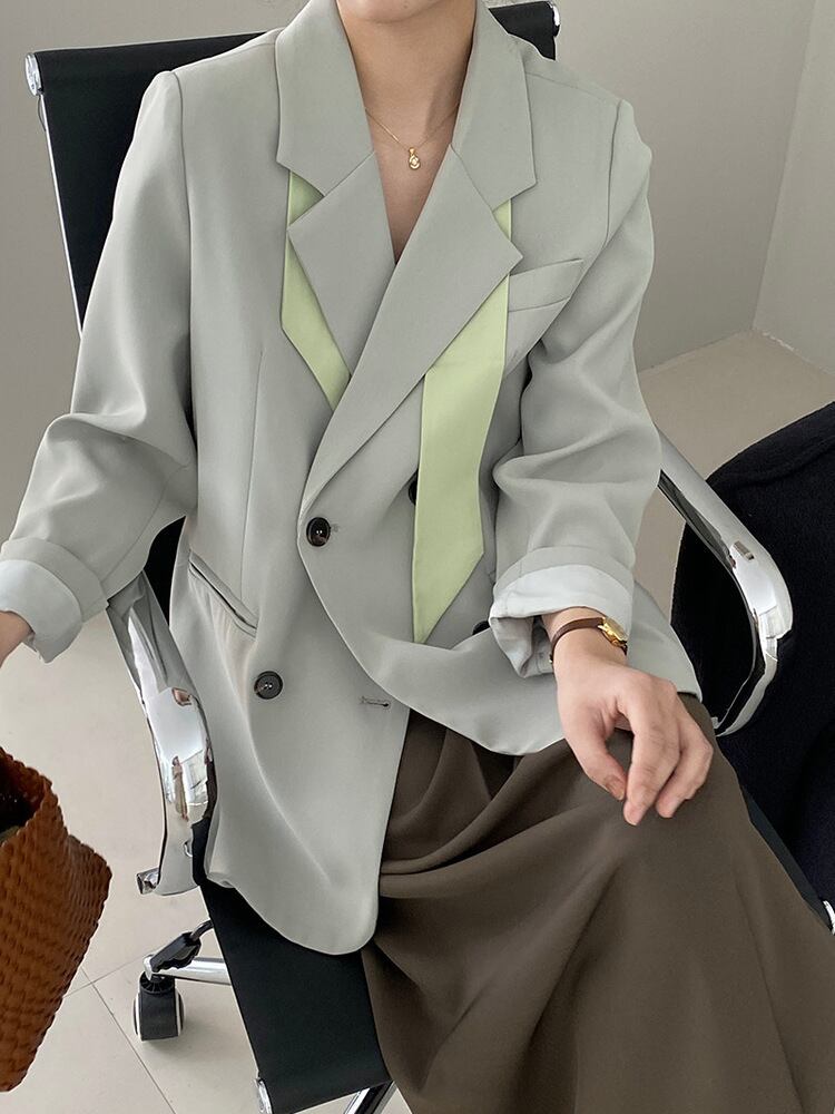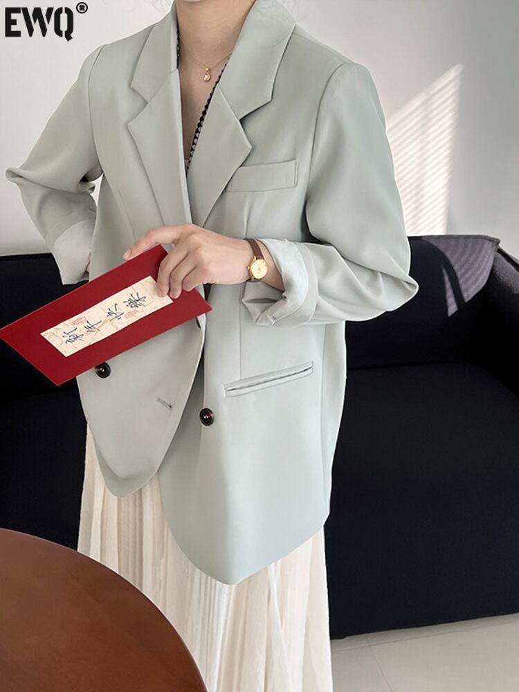 【EWQ】レディースエイブルダブルブレストポケットブレザーコートノッチ付きシンプル長袖スーツジャケット春秋トップス537 ロング スプリング 春物 オータム 秋物
