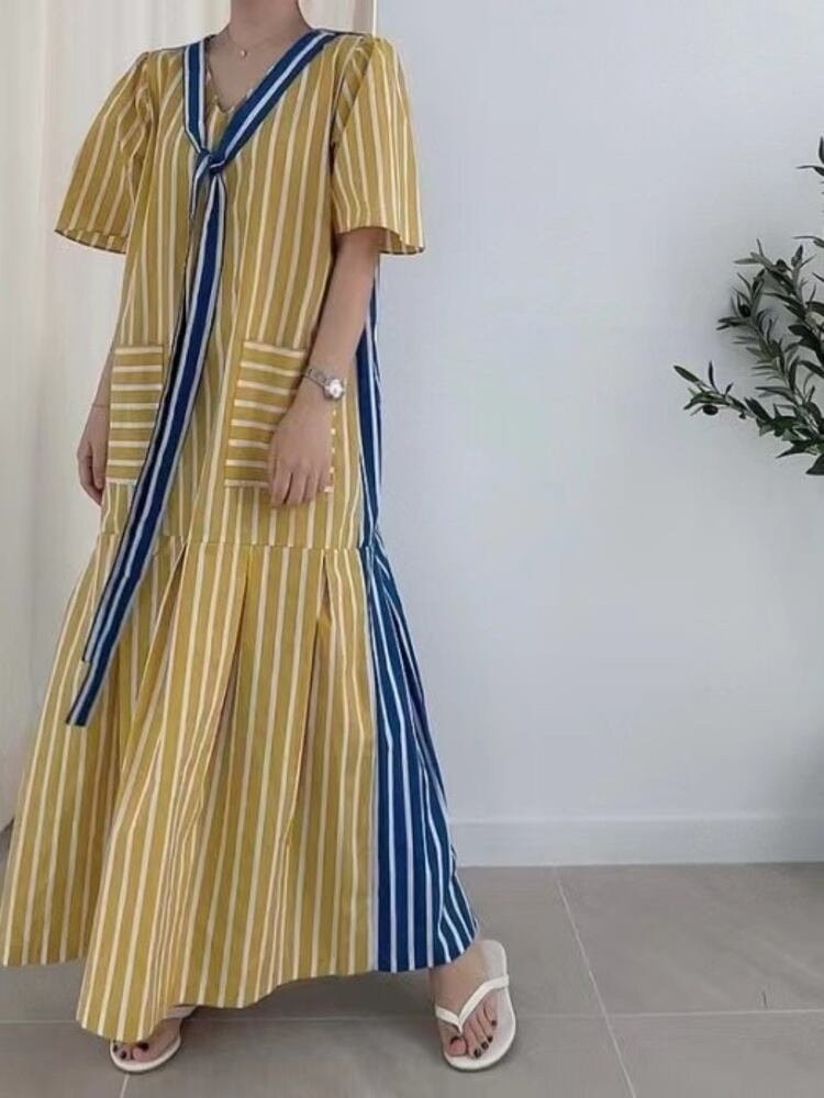 [EWQ] V ネック レース アップ ストライプ ドレスショート コントラスト ポケット マキシ ドレス夏緩い Vestido 427 サマー 夏物 Vネック レースアップ