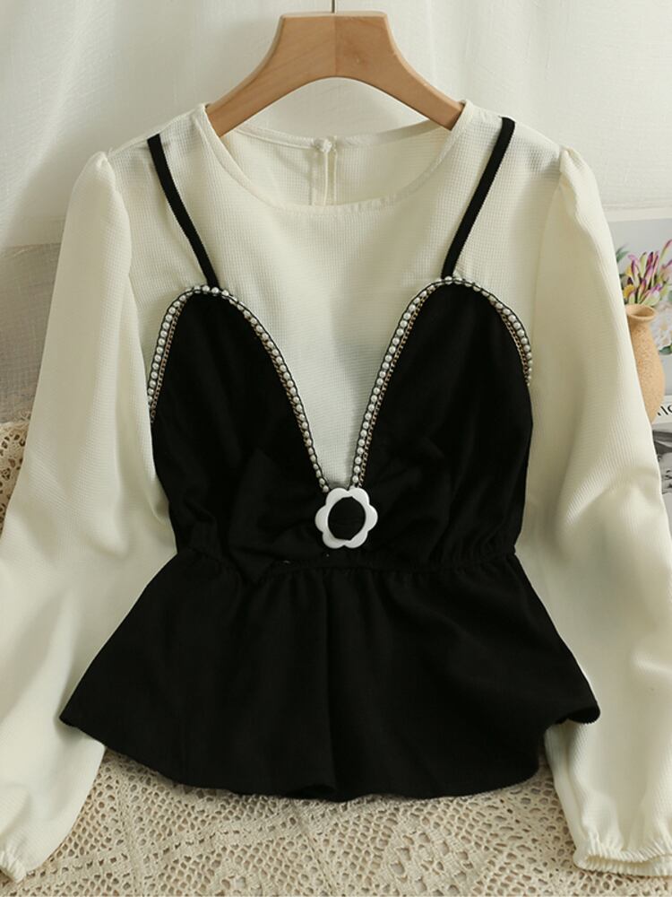 [EWQ] スプライシング フェイク ツーピース Oネック シャツ バブルスリーブ ボウ ブラウス トップス 春 秋 潮 レディース 16Y6157 リボン スプリング 春物 オータム 秋物