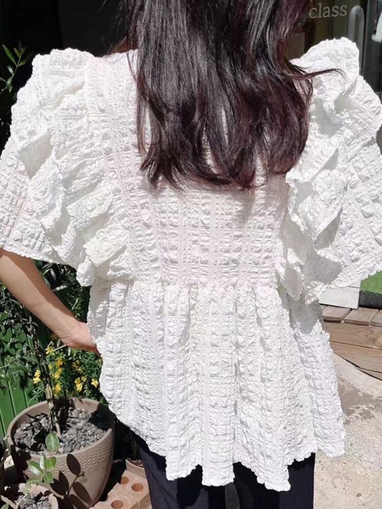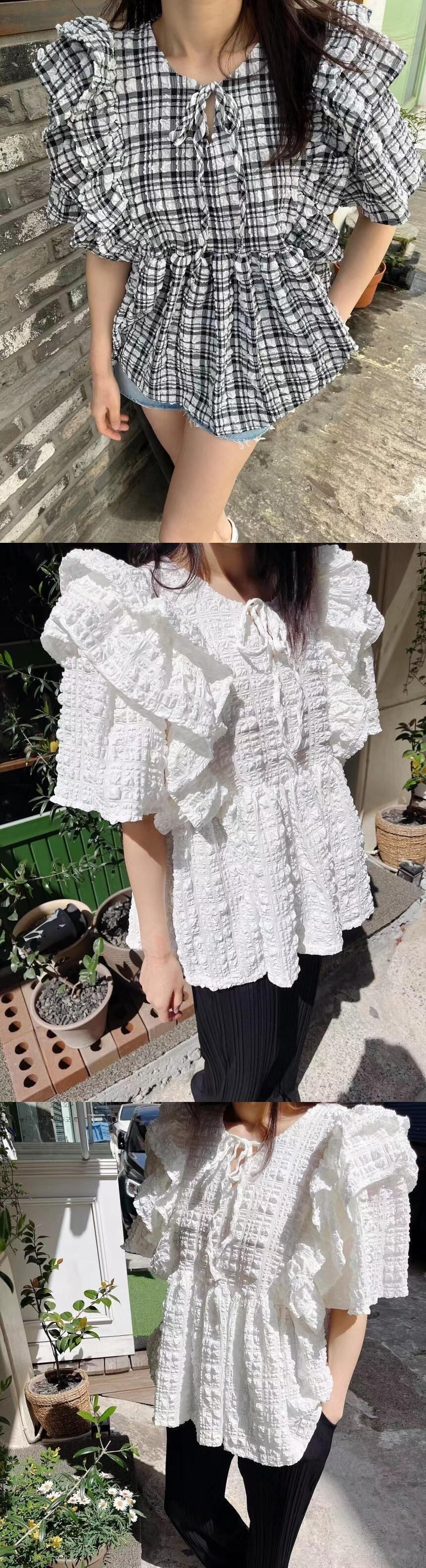 [EWQ] O ネック レースアップ スプライス フリル シャツ レディース バブル チェック コントラスト 半袖 サマー トップ 16Y7296 ショート ハーフスリーブ 夏物 Oネック
