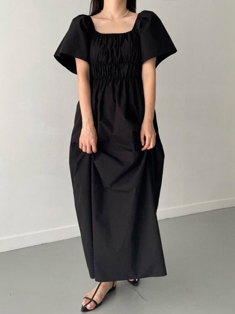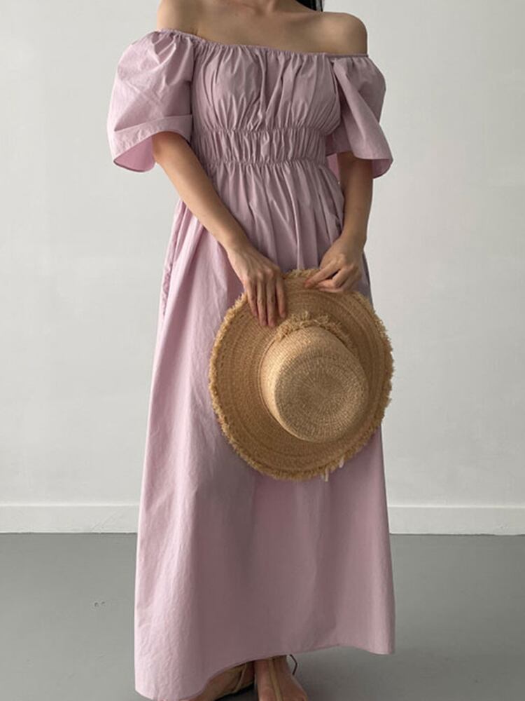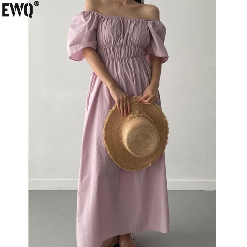 [EWQ] オフショルダー 2 着用プリーツ ドレス夏マキシ ピンク ルーズ ドレス ウエストゴム Rode 75 エラスティック 伸縮 サマー 夏物