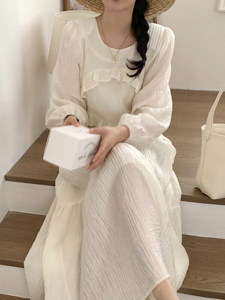 [EWQ] フリル接合 O ネック プリーツ ドレス ルーズ ランタン スリーブ ドレス春秋紫 Vestido 6Y7098 ランタンスリーブ スプリング 春物 オータム 秋物 Oネック パープル