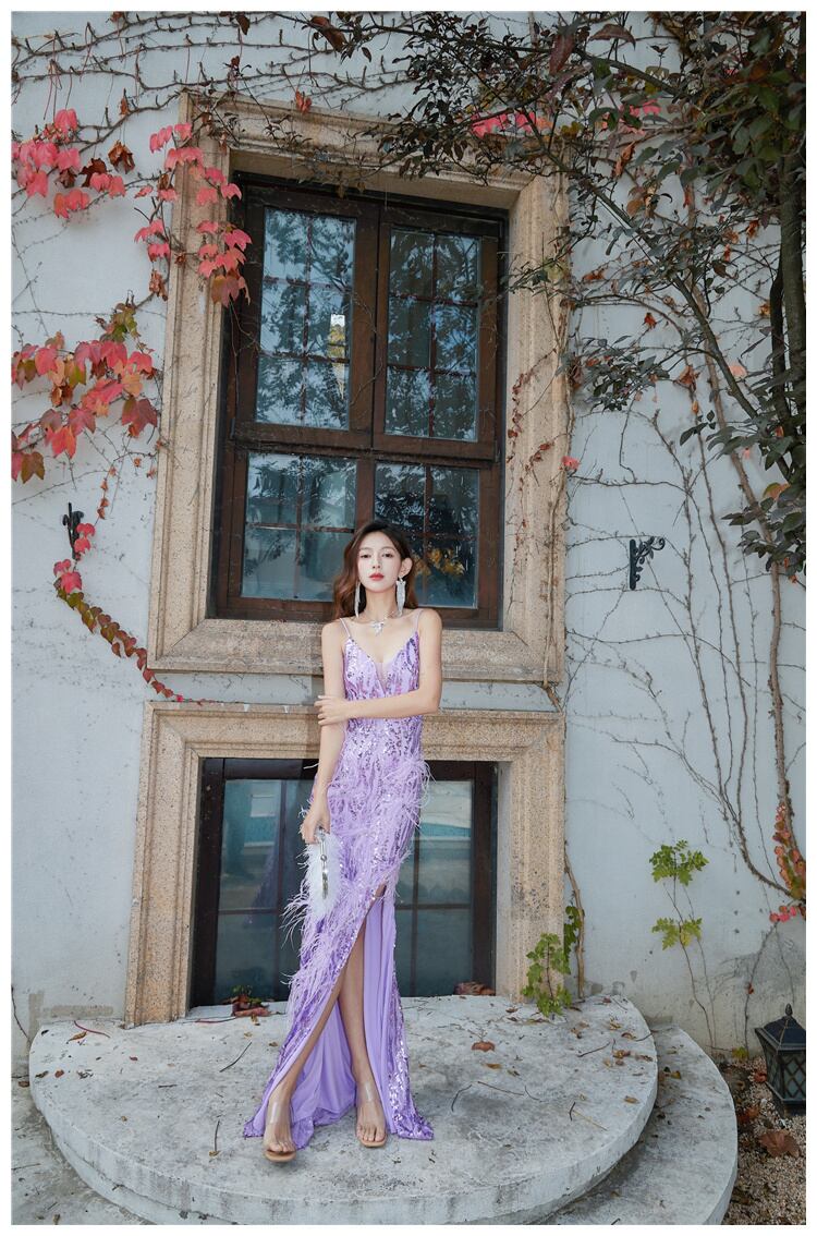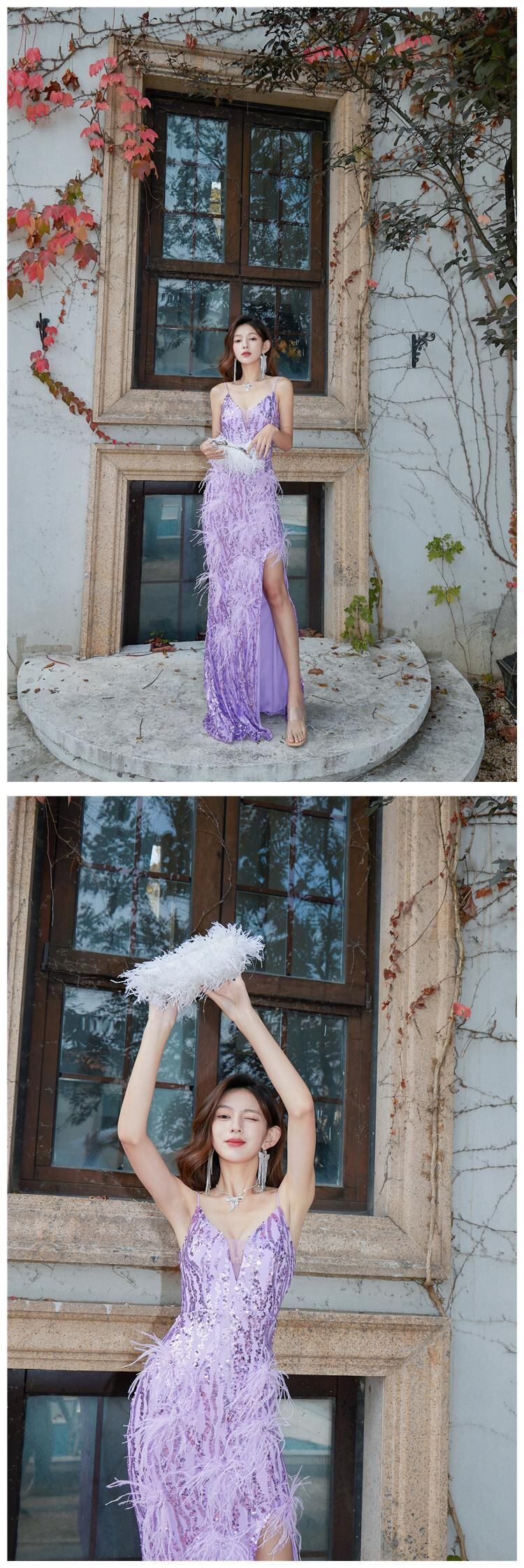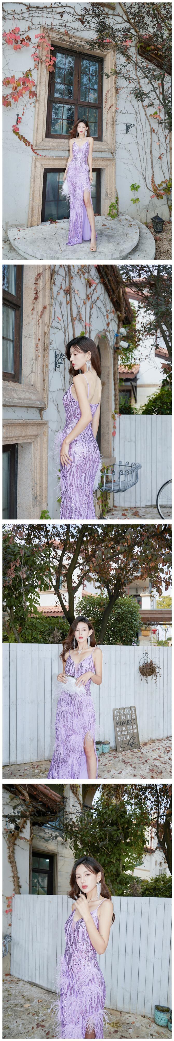 [EWQ] セクシースリングドレスフェザーパープルスパンコール Vestido ドレス春夏ホリデーパーティースプリットローブポリエステル 16Y6332 スプリング 春物 サマー 夏物