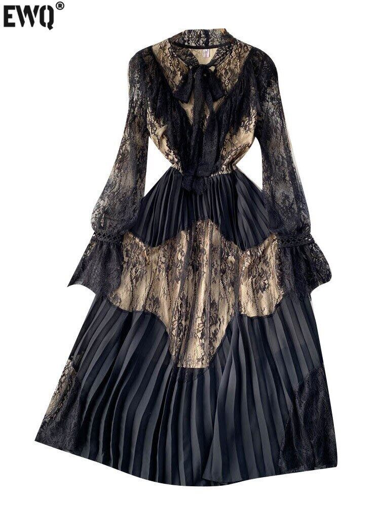 [EWQ] ランタンスリーブメッシュレース中空アウトドレススタンドカラーボウタイドレス春夏 Vestido 003 リボン スプリング 春物 サマー 夏物