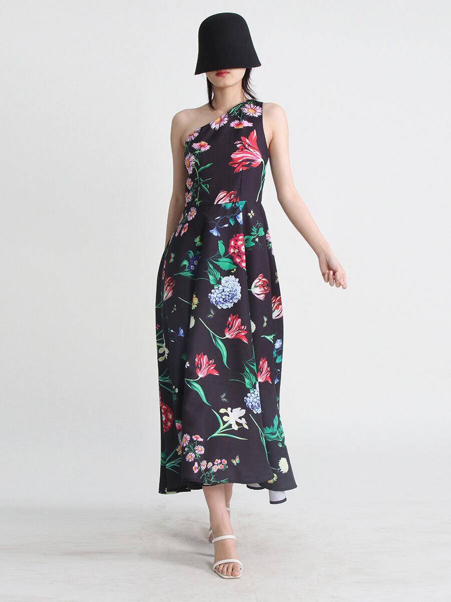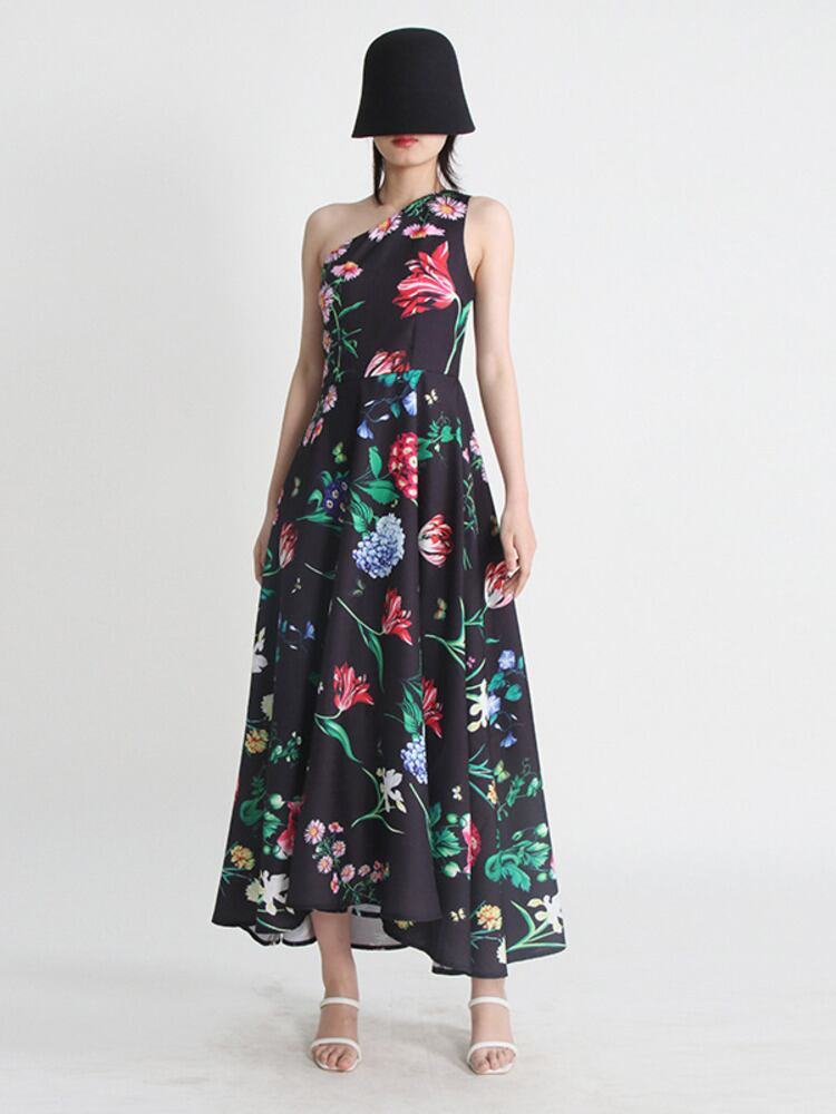 【EWQ】斜め衿ノースリーブプリントドレス イブニングパーティー コントラストカラーフラワーAラインドレス 夏潮 Vestido 244 サマー 夏物 フラワーデザイン