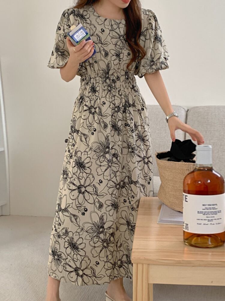 [EWQ] O ネック花柄プリーツ ウエスト ドレス パフ スリーブ コントラスト カラー マキシ ドレス夏潮 Vestido サマー 夏物 Oネック