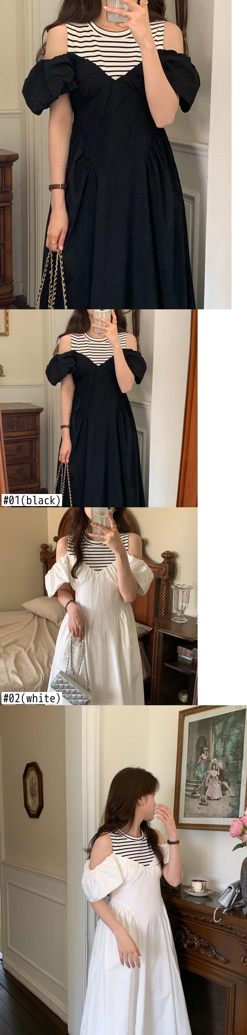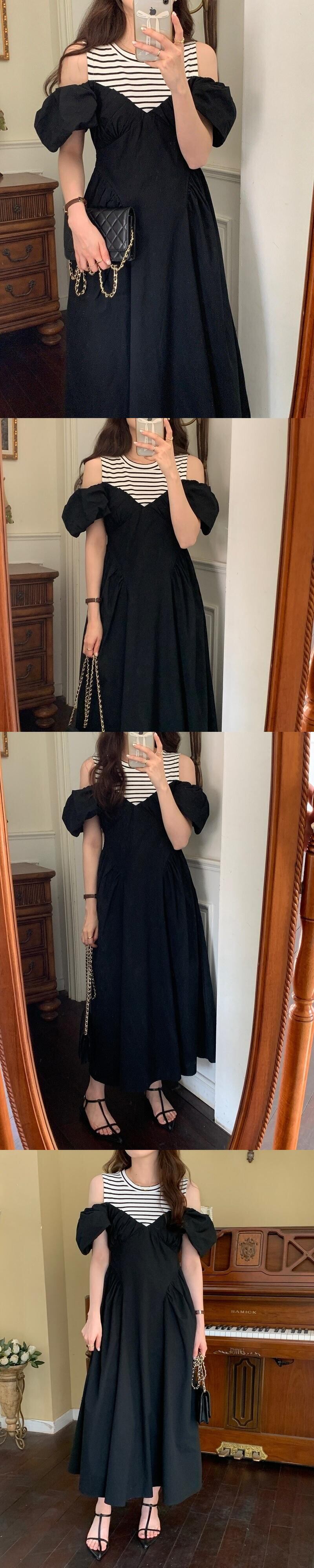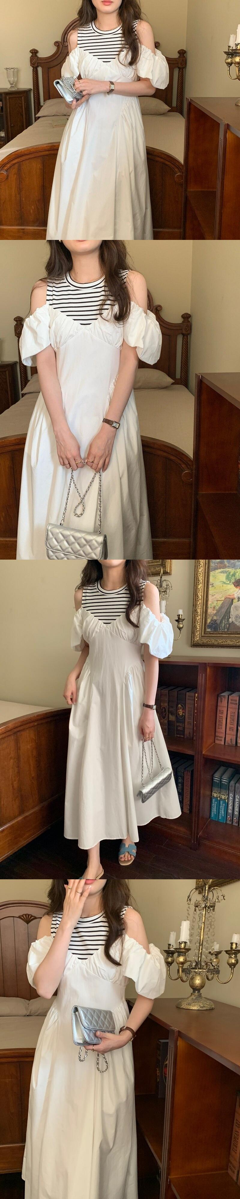 [EWQ] オフショルダースプライスストライプドレス中空アウトパッチワーク O ネックドレス夏トレンド Vestidos サマー 夏物 Oネック
