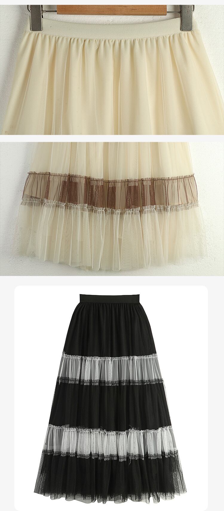 [EWQ] コントラストスプライスストライプメッシュ A ラインスカートプリーツ弾性ウエストミッドカーフスカート春夏 エラスティック 伸縮 スプリング 春物 サマー 夏物 Aライン