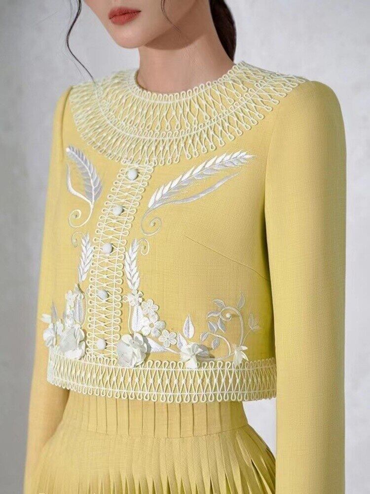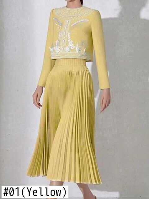 [EWQ] 高級ツーピースセット刺繍フラワートップ + プリーツ A ラインスカート春秋イブニングパーティースーツ 16Y6403 スプリング 春物 オータム 秋物 Aライン フラワーデザイン