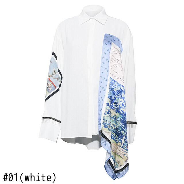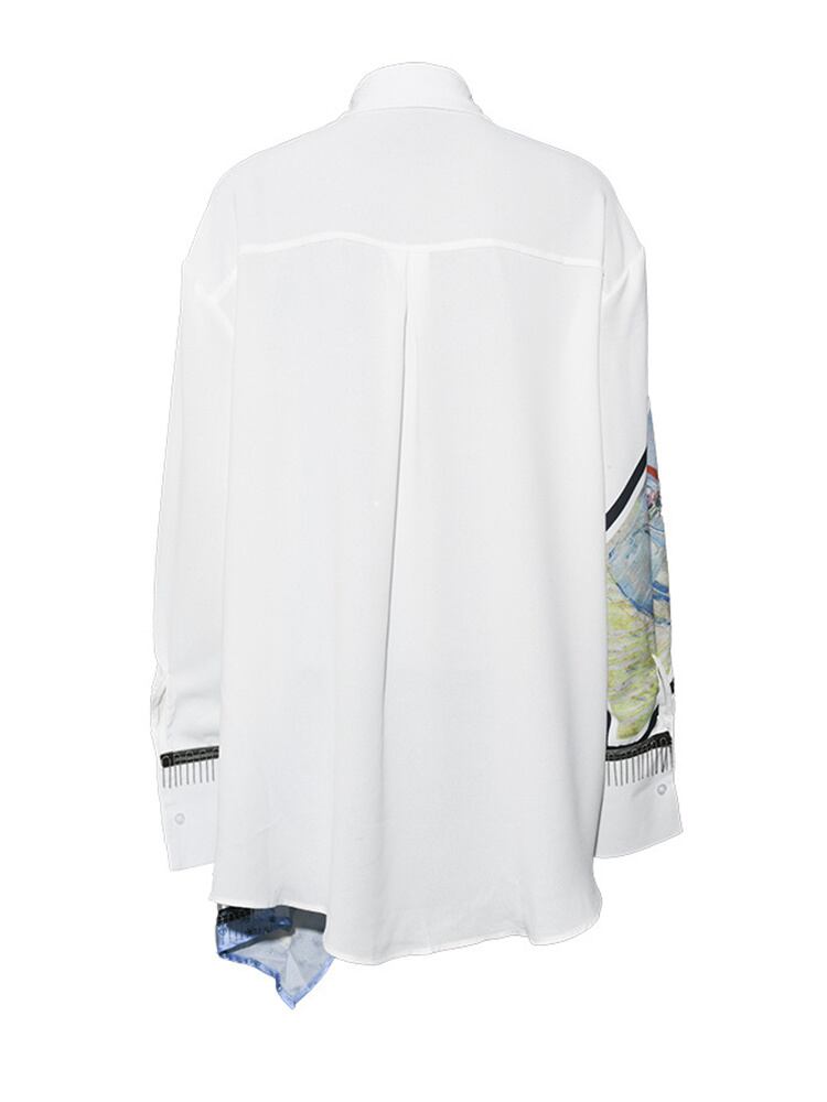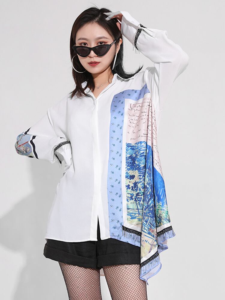 【EWQ】ホワイト変則柄プリント ビッグサイズ ブラウス スプリングラペル 長袖 シャツ キレイめ レディース服 ロング 春物