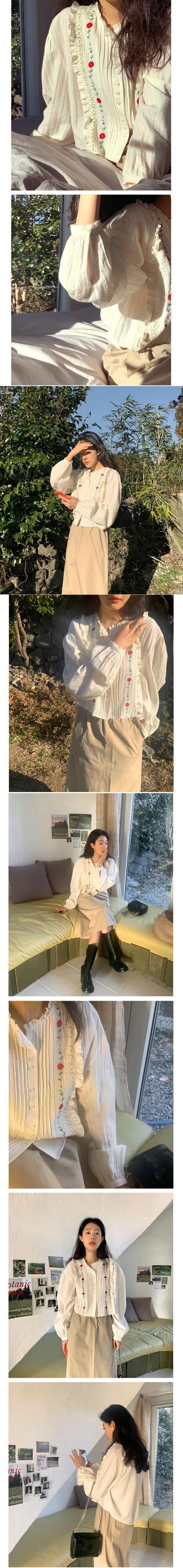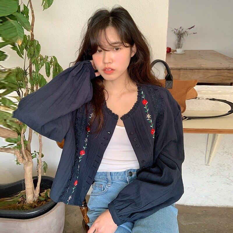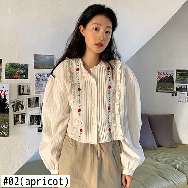 【EWQ】シック スウィート ラウンドネック Oネック 花刺繍 プリーツ パッチワーク シャツ パフスリーブ ブラウス 春 大人ガーリー キュート カジュアル スプリング 春物 フラワーデザイン