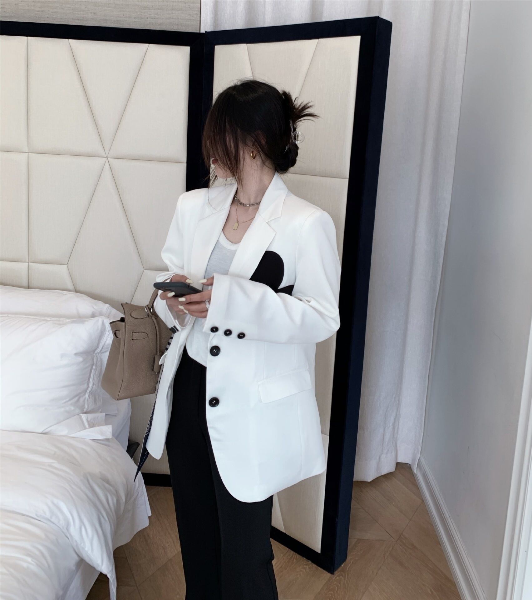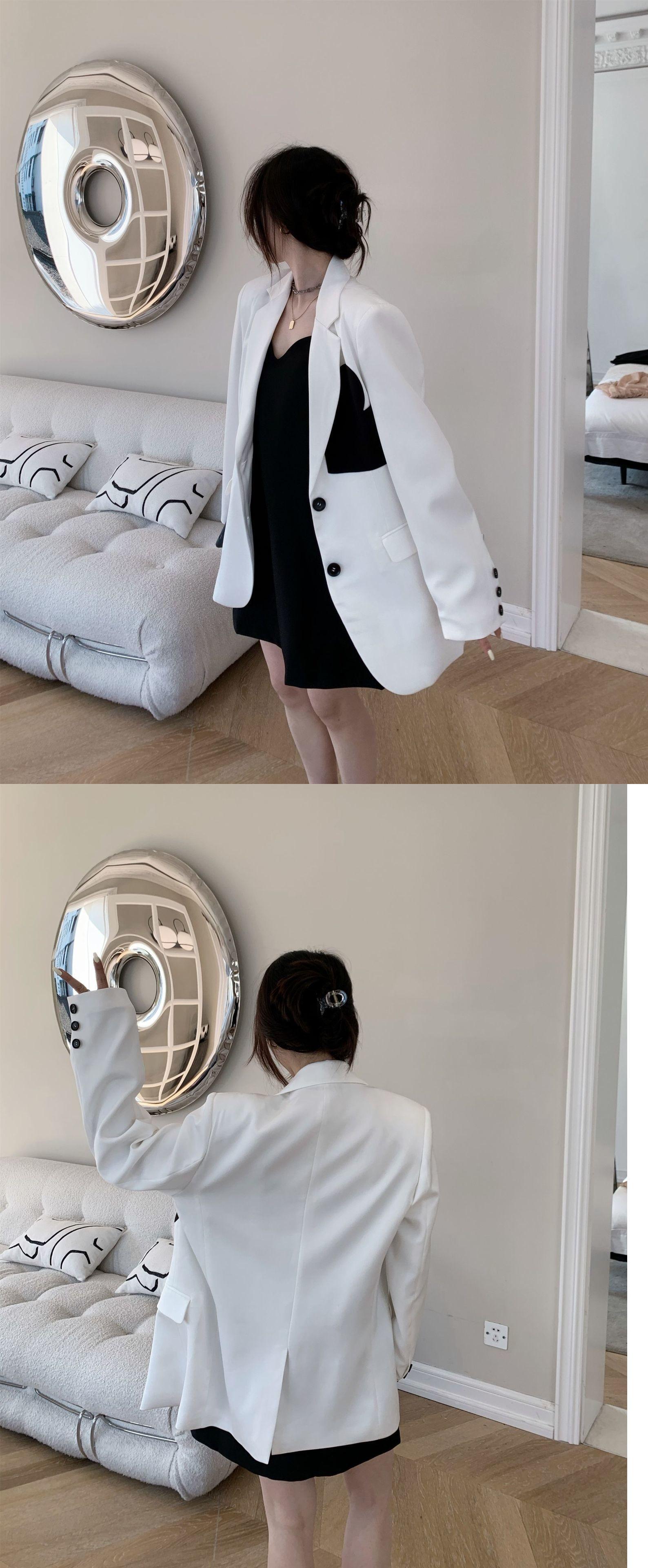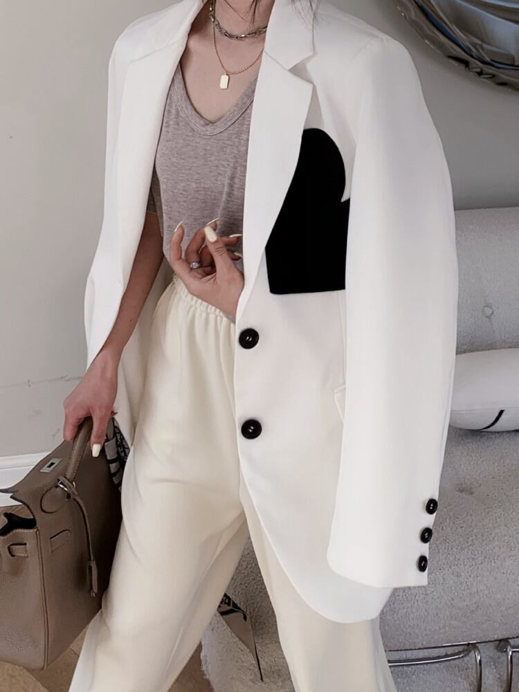 [EWQ] ラブコントラストカラー長袖ブレザーコートノッチポケットブロッキングカラースーツジャケット春秋トップ ロング スプリング 春物 オータム 秋物