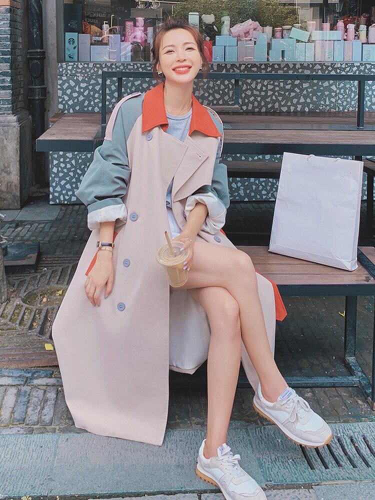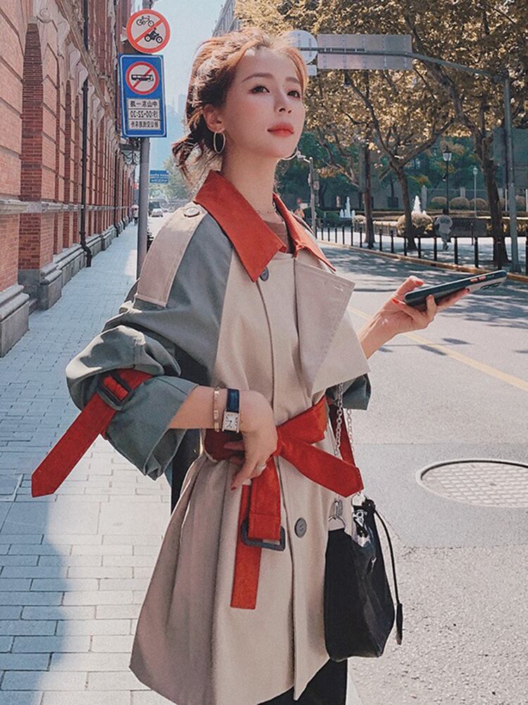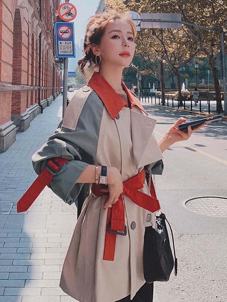 【EWQ】ステッチ コントラストカラー ダブルブレスト ロングオーバーコート ラペル レディース ウインドブレーカー スプリング 16Y1192 春物