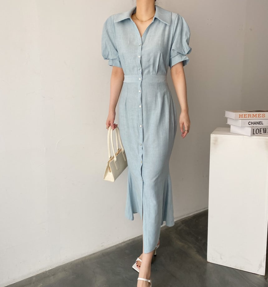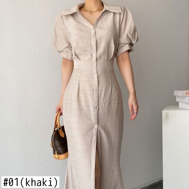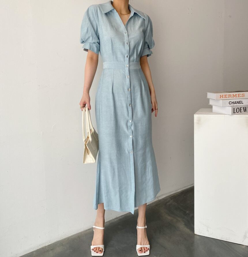 [EWQ] ブルーラペルシングルブレストドレスパフスリーブスプリットドレスサマーシルムオールマッチ服 179 夏物