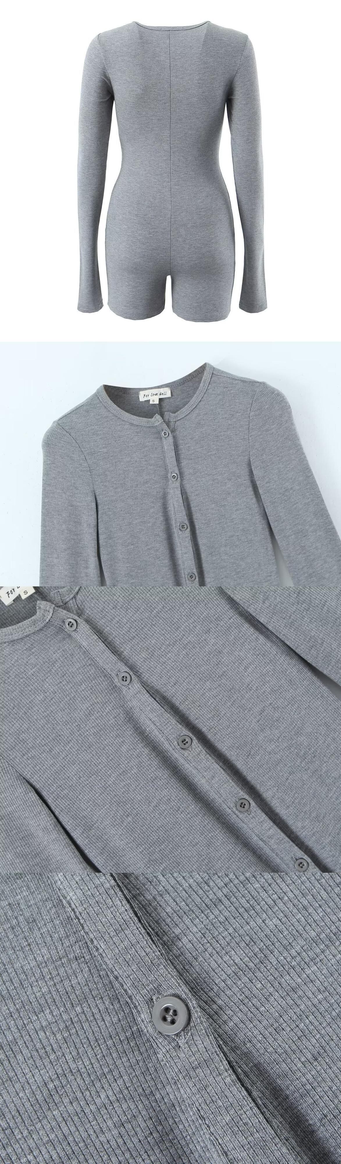 [EWQ] O ネック ボタン ニット ジャンプスーツ弾性スリム グレー長袖スポーツ ランニング プレイスーツ春夏 16Y6204 ロング エラスティック 伸縮 スプリング 春物 サマー 夏物 Oネック